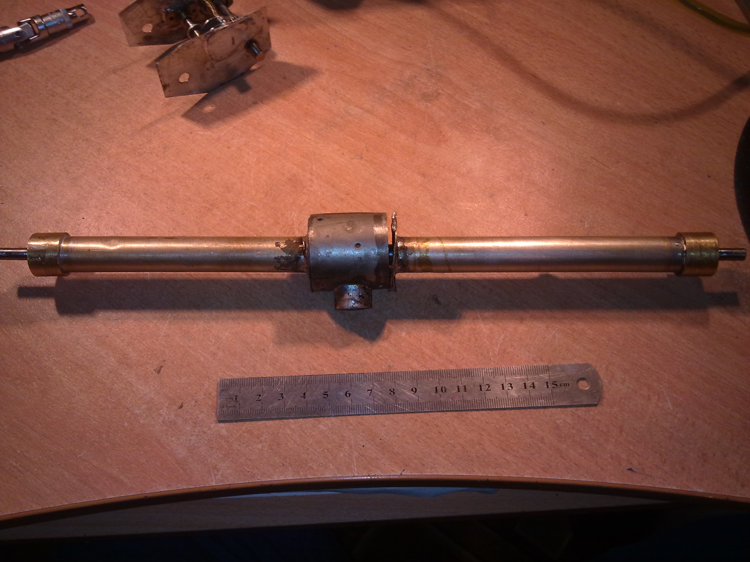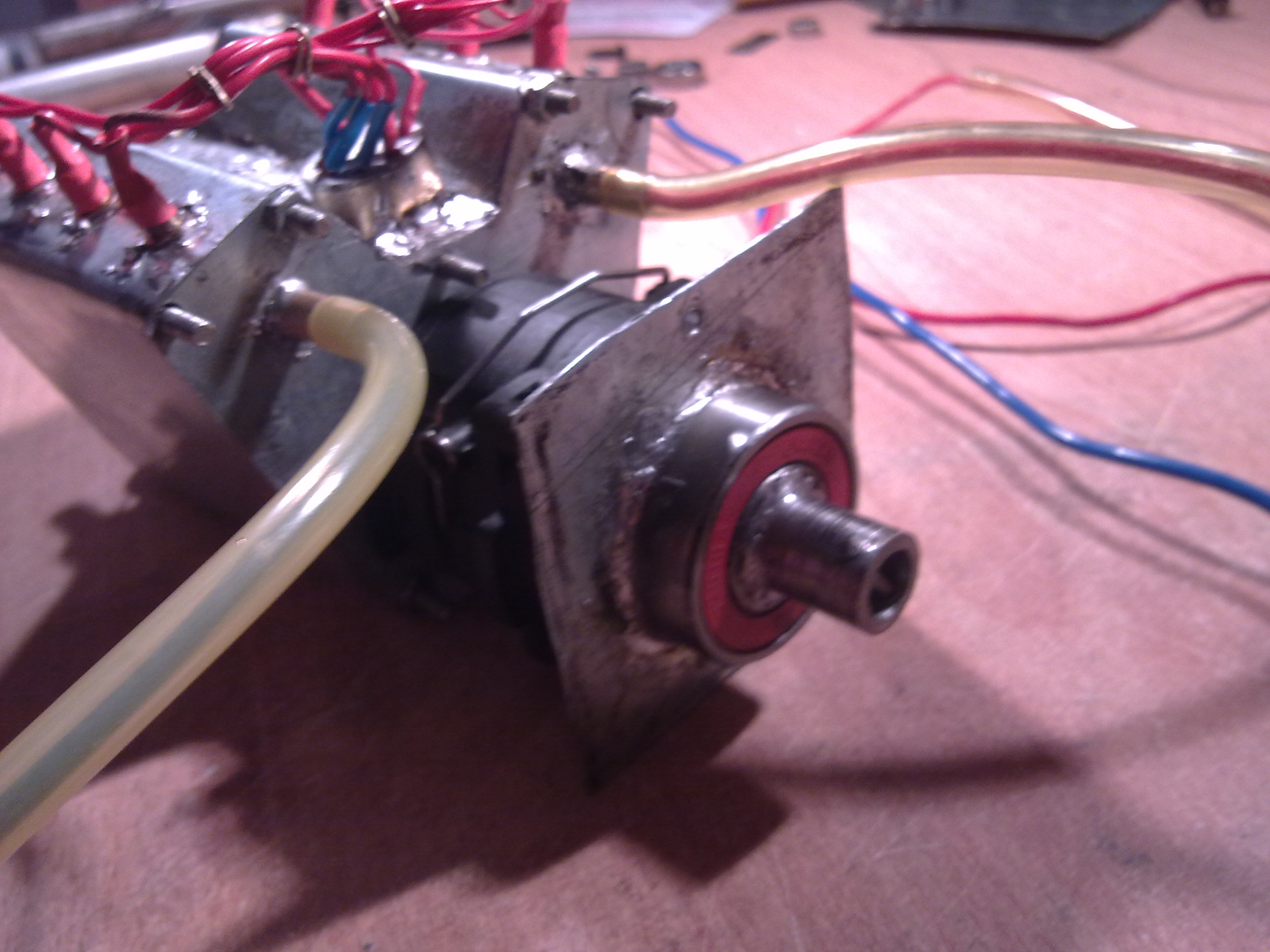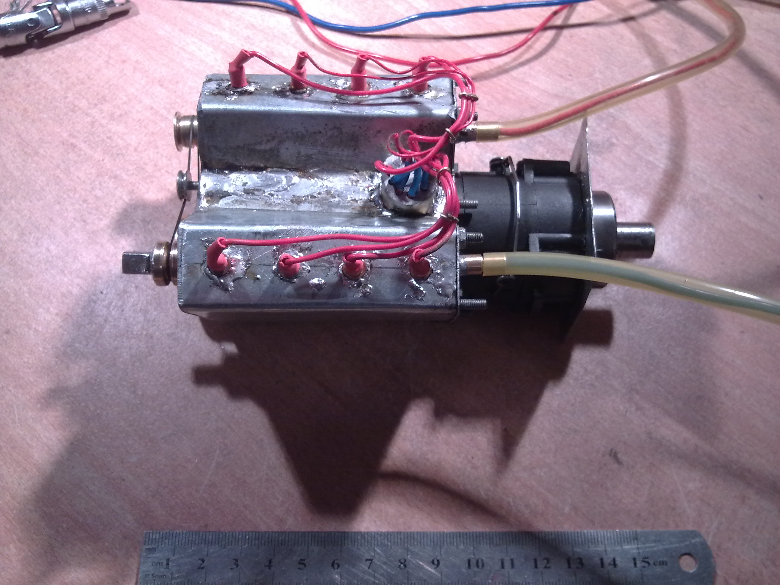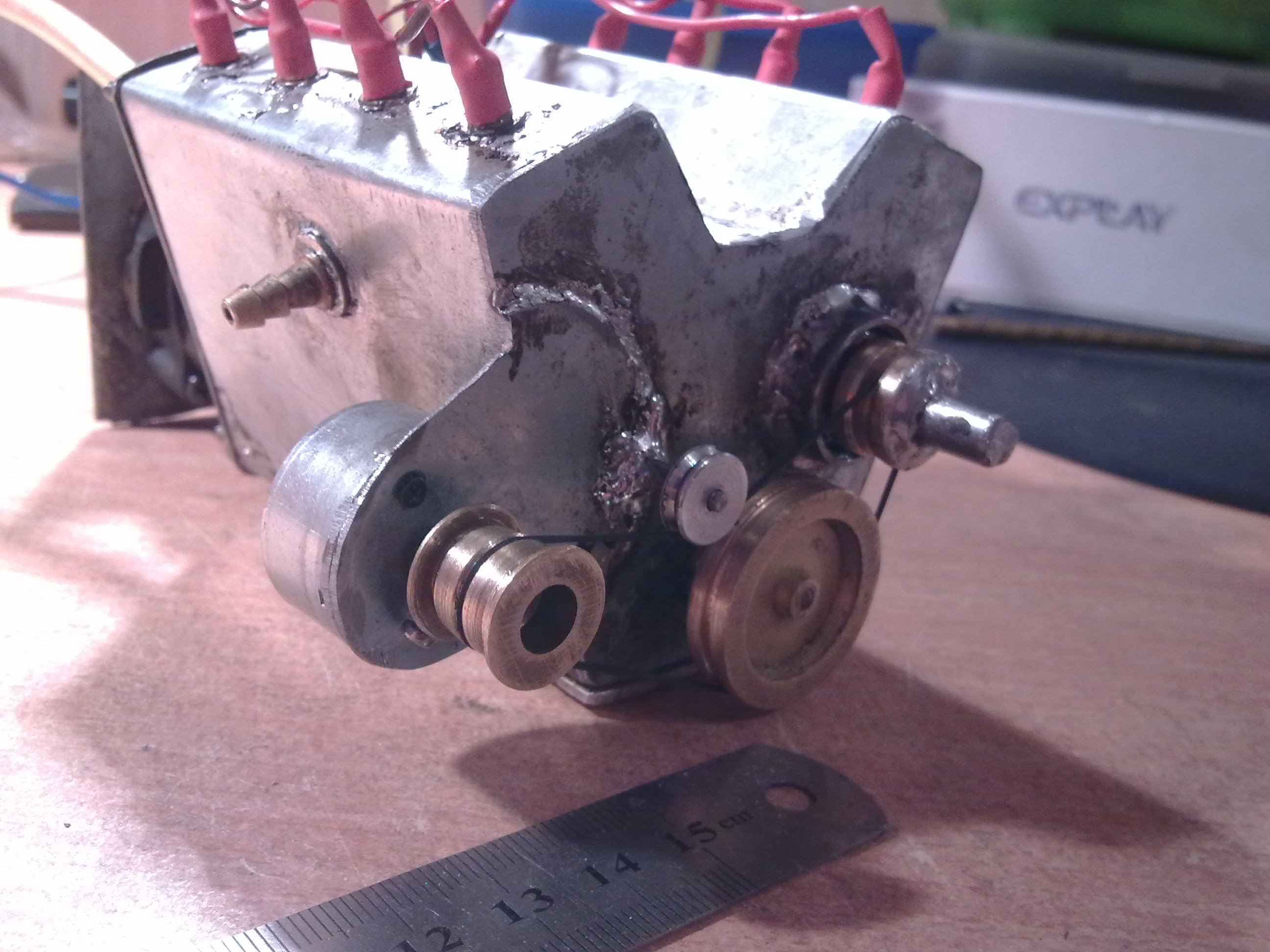 объясню пока что так, коробка сделана из двухскоростного редуктора от шуруповерта, скорость измениется блокировкой одной ступени, редуктор был уменьшен в размере и доработан. Мосты без дифференциала! изготовлены методом пайки (паяльная кислота помогла), внутри стоят просто 2 конические шестерни, все на подшипниках. Раздатка по типу как у газ66, только без пониженной передачи. ну и муляжный V8 я просто спаял из оцинковки и жести, получилось прикольно, для вида поставил генератор, ремни, ну и специально маленький мотор чтобы это все крутил