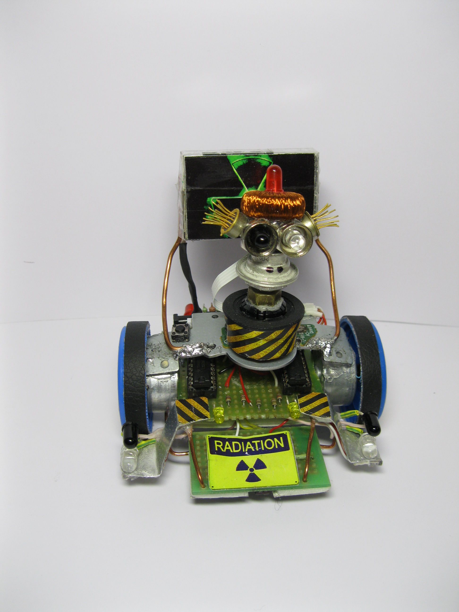 2. собственно часы (подвижная схема), приклеена к второй части вентилятора, на которой намотана вторая катушка примерно 100-130 витков...дальше диодный мост на 1n4007 из экономной лампочки, стабилизатор напряжения 7805 и микроконтроллер PIC 16F84A. Светодиоды посажены на ноги МК через ограничивающие резисторы. Отображение информации происходит когда схема пролетает над ИК-светодиодом вмонтированном в корпусе.