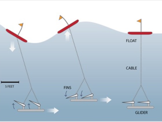 Фокус в том что хотя сама волна и движется-колбасится, но масса воды под волной - неподвижна. Достаточно соединить тросиком поплавок и крыло, которое находится в толще неподвижной относительно волны воды как система заработает. То есть, важна только длина этого троса.