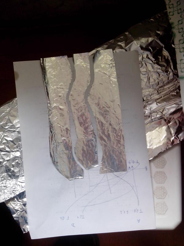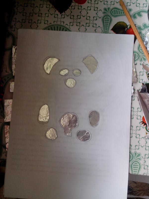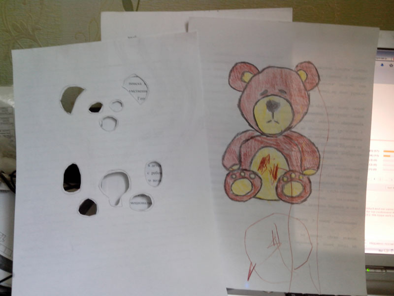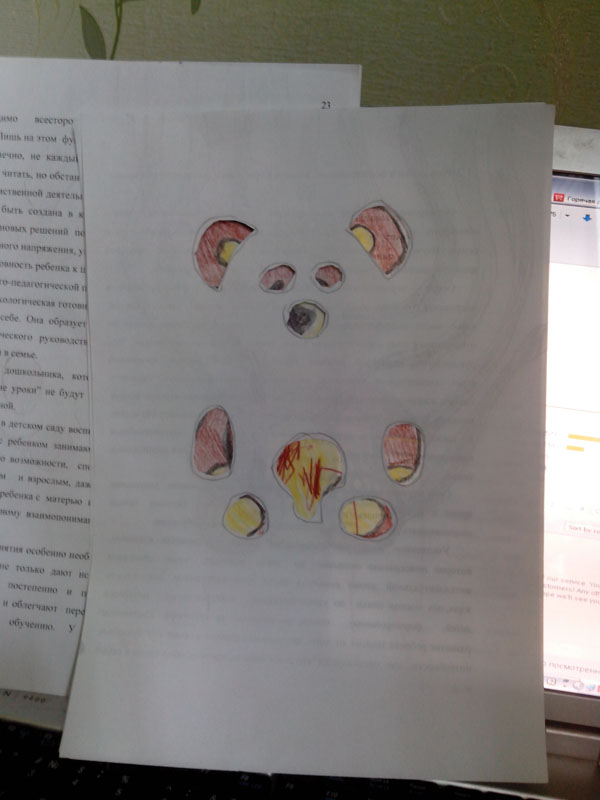 ).Накладываем листок, отмечаем и прорезаем места будущих кнопок. В данном случае - уши, глаза, нос, лапы, живот.