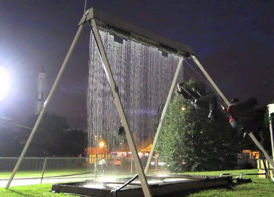 HOW THE WATERFALL SWING WORKS Water recirculates through 384 independently controlled solenoid valves at the top of the structure to create a wall of water. This water starts from a collection pool on the ground and is pumped up to a 4" distribution pipe that feeds the solenoids. Rotational encoders mounted on the swing axis gather information about the angle and speed of each swing. That information is sent to a computer that predicts the action of the rider. The computer then creates a hole in the wall of water, allowing the rider to swing through without getting wet.