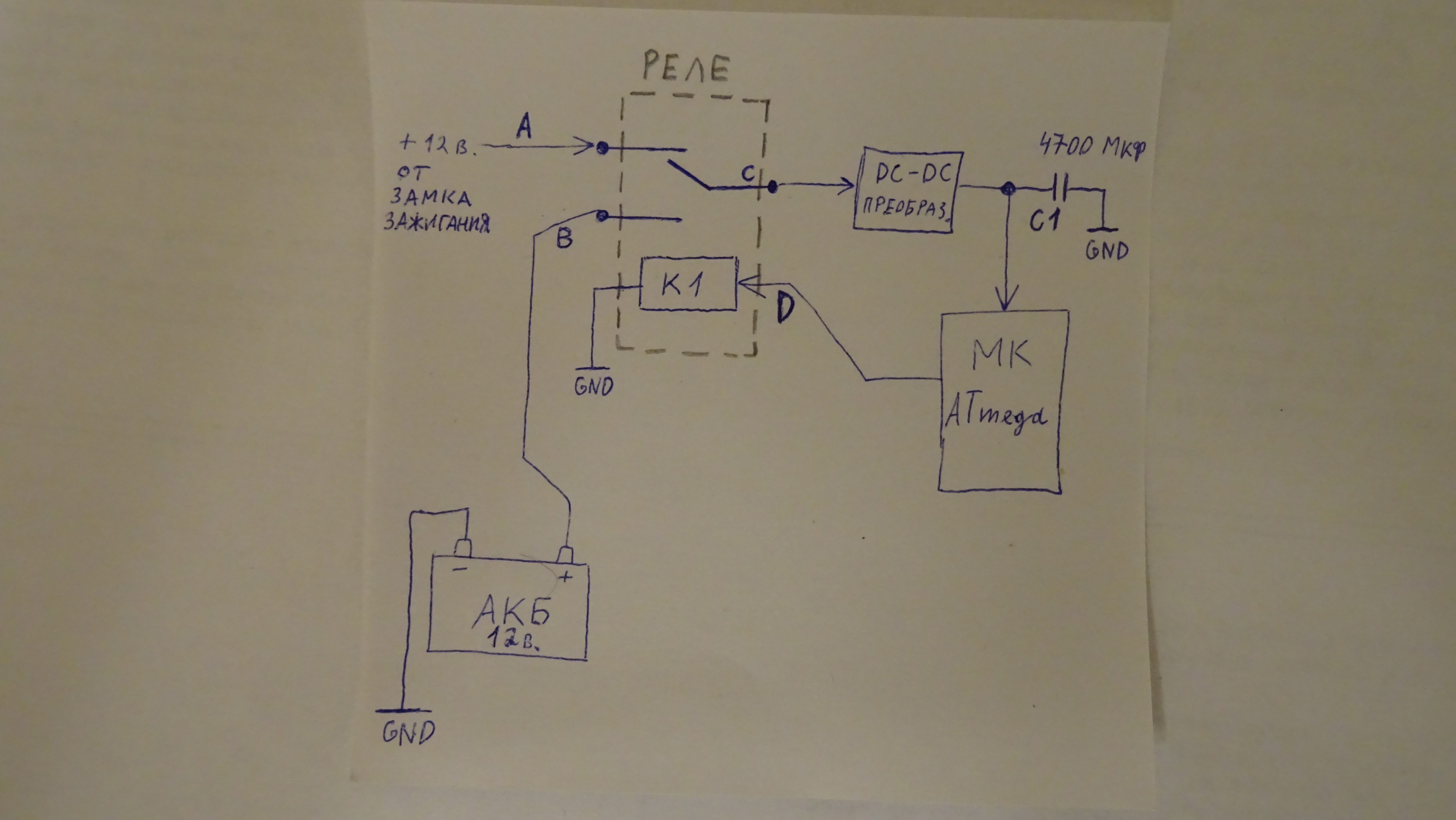 2) Я думаю над вариантом как на представленной схеме во вложении. Используем 5-и контактное реле для переключения питания и конденсатор С1 как буфер для сглаживания провалов напряжения во время переключения. Когда на контакте реле А появляется плюс от замка зажигания, то реле находится в нормально замкнутом состоянии контактной группы С и А, устройство начинает запитываться, выдерживает паузу на время зарядки буферного конденсатора и совершает переключение питания на контактную группу В и С, тоесть на прямую от аккумулятора.