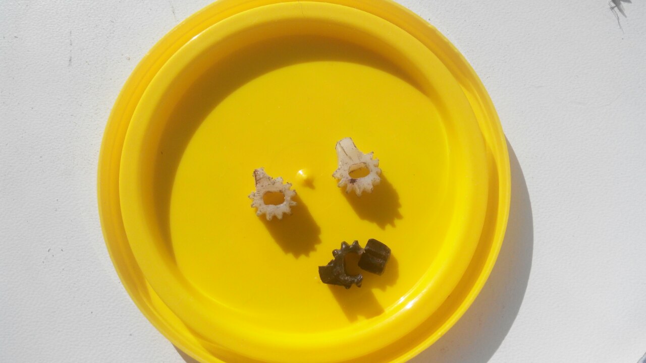 Да шестерня мелкая, вот фотка оригинала: те 2 белые, люди сами точили надфилем, во экстрим)) эта шестерня стоит в каком то японском проигрывателе старом, типа ручку крутишь а там линейка переключает. шестерня в зацеплении с зубчатой рейкой. тот наплыв для ограничения хода.