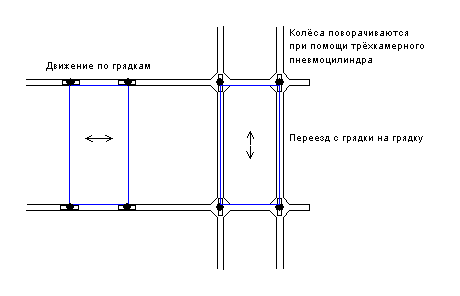 Вот сделал схематичный набросок укладки "рельс" и положение робота в рабочем положении и при переезде с грядки на грядку.dimamichev писал(а):Не товарищи! Я хочу от автора темы узнать как это копает сама? Вот телеге (ой как не технологичной)многие сотни лет (и ещё столько же будет), а мотор к ней приделали относительно недавно. И лопата, тоже из той оперы, ей тоже немало. А вот про мотор к ней чтоб её первичные свойства сохранились, а копала сама я не слыхал. Бензолопата ? А как её сделать?