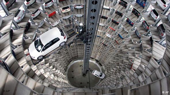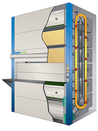 Какая проблема? Вся нагрузка исключительно на железо. Заталкивается назад точно так же - опускаем контейнер на платформе лифта до нужного этажа карусели и заталкиваем контейнер с платформы на стеллаж. Там, конечно, будут некоторые сложности с управлением, но в общем ничего космического.