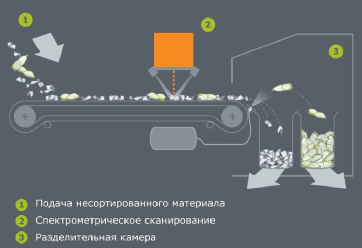 По конвейеру едет мусор. Видеокамера(ы) (и другие датчики - магнитные, электромагнитные, спектроанализаторы, пр.) его отсматривают, узнают интересующие фракции (алюминиевые банки, стеклянные бутылки, пластиковые бутылки, прочий пластик, прочий металл, бытовая техника, электроника, пр.) и манипулятор их хватает и раскладывает по коробочкам.