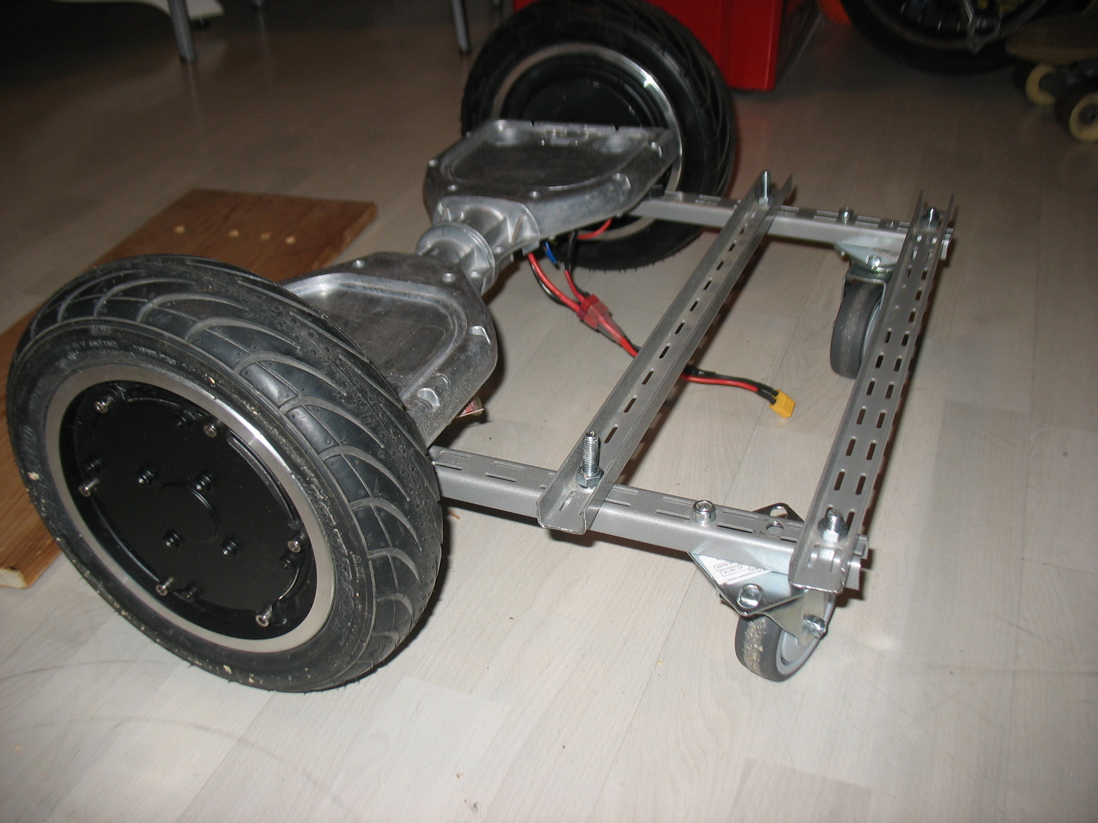 Универсальная тележка. Контроллеры от 2-х платных гироскутеров. Сейчас собран вариант с подруливающими колесиками. Колесики можно поменять на 2-й гироскутер. Получится тележка 4x4. Но дома такое испытывать жесть, колеса при поворотах убивают ламинат. Один раз попробовал, больше не хочу. Поэтому дома испытания только на подрул. колесиках. Все детали из максидома