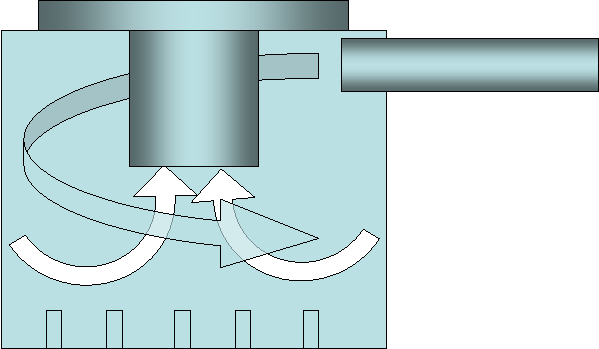 Вращаясь, рабочее колесо сообщает круговое движение жидкости, находящейся между лопатками. Вследствие возникающей центробежной силы жидкость от центра колеса перемещается к внешнему выходу, а освободившееся пространство вновь заполняется жидкостью, поступающей из всасывающей трубы под действием создаваемого разрежения.