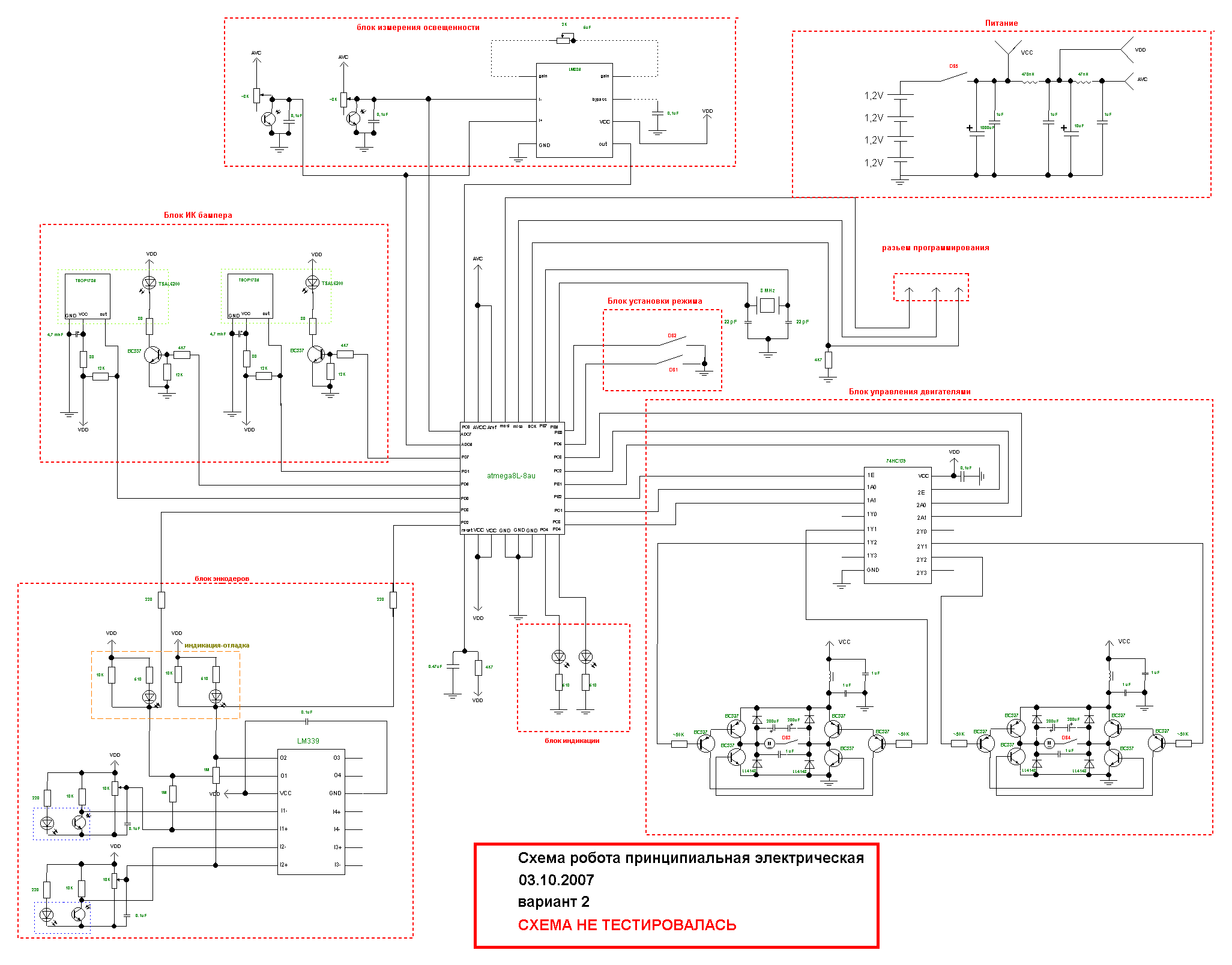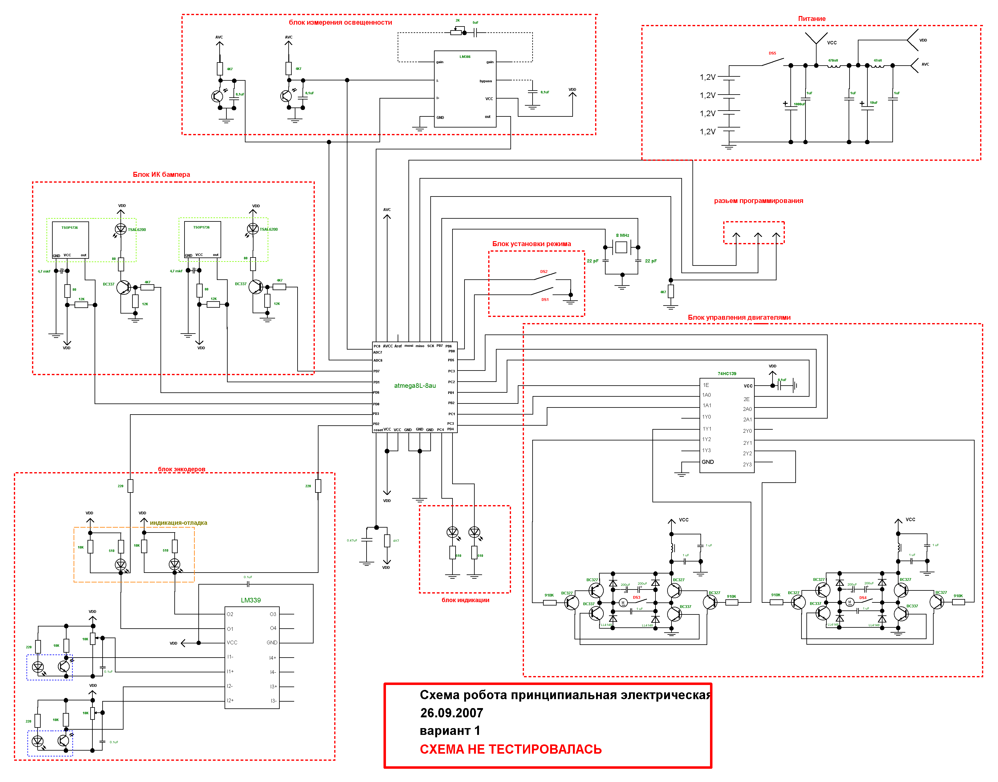 Нарисовал принципиальную схему будущего робота. Решил по полной использовать потенциал восьмой атмеги, задействовал все ноги. DS- dip swich на 6 переключателей, задает режим работы и отключает питание. Из нарисованного протестировал на макетах ТСОП и Н-мост, измеритель света и энкодеры не тестировал. Собственно энкодеры собраны по стандартной схеме, интересуют в основном номиналы. Обвязка ТСОПов взята полностью из даташита ( на мекете были небольшие отличия) , кварц взят для большей стабильности частоты ради ТСОПов. на моторах повешены электролиты- из опытов, моторы с ними получают большую мощность. Частота ШИМ регулирования-300 Гц. Из совсем экспериментального- измеритель уровня мощности. 2 фототранзистора на АЦП по стандартной схеме, и моё ноу-хау 386 ОУ для работы в режиме а-ля бим ( но АЦП считается только разность напряжений). Я поставил большую индуктивность на входе цифровой части, и еще одну поменьше на входе аналогового питания- это нормально ( в даташитах вроде так)? Хочу использовать встроенную опору для АЦП, будет ли она стабильной?