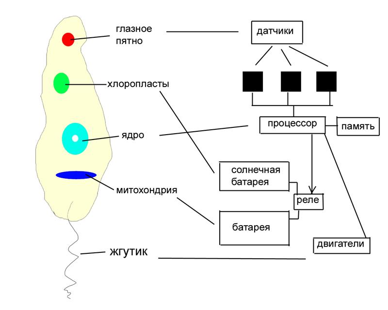 Додумал принципиальную схему робота. В качестве основы решил взять проверенную временем "разработку" Матушки Природы .. в частности одноклеточную водоросль - Эвглена зелёная (Euglena viridis). Помнится ещё в школе их под микроскопом показывали. Решил выбрать именно её, т.к. относительно просто устроена, является автотрофом (поглащает свет, а не охотится на других зверушек). Если я что-то упустил в схеме - прошу меня поправить, проверить. Чуть попозже выложу примерный вариант алгоритма и примерную электрическую схему приборчика (пока в разработке).