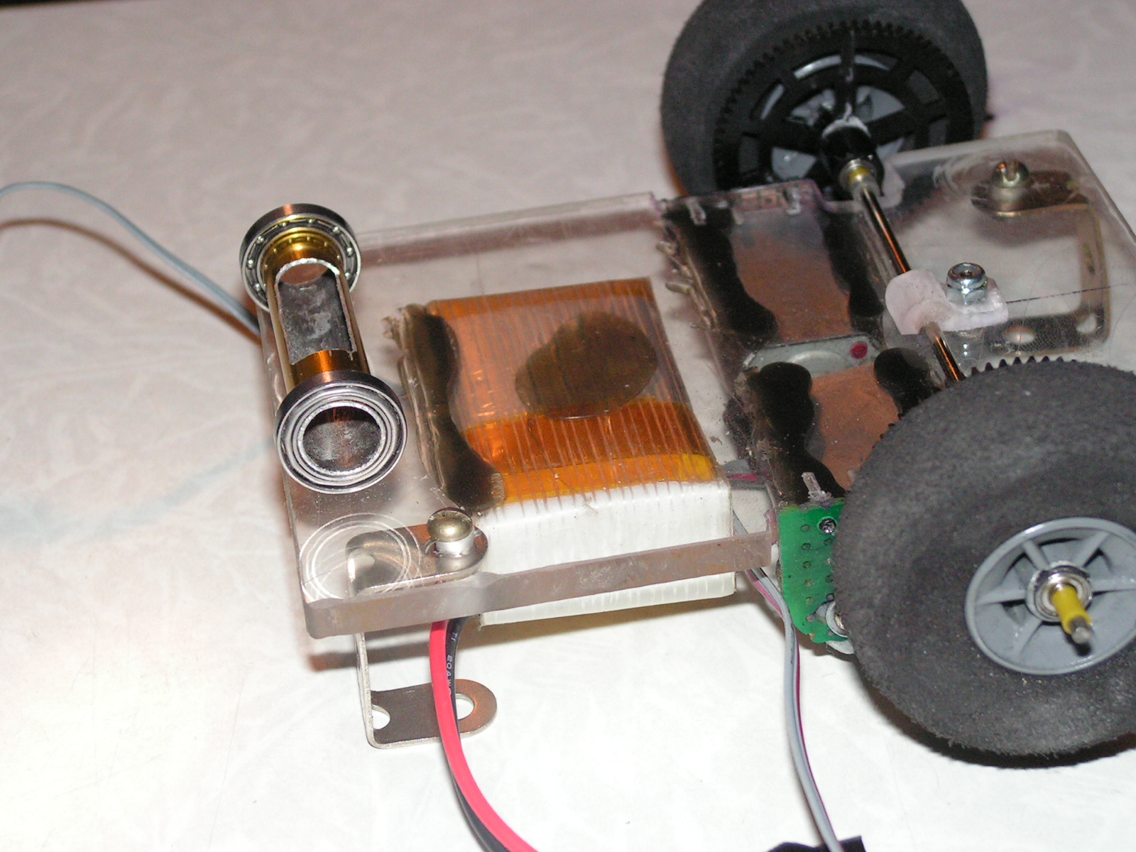 колеса тоже модельные, пришлось рассверлить ось до 4мм и с одной стороны 6мм под подшипник (к сожалению 5x2 подшипников небыло, они лучше подошли бы)