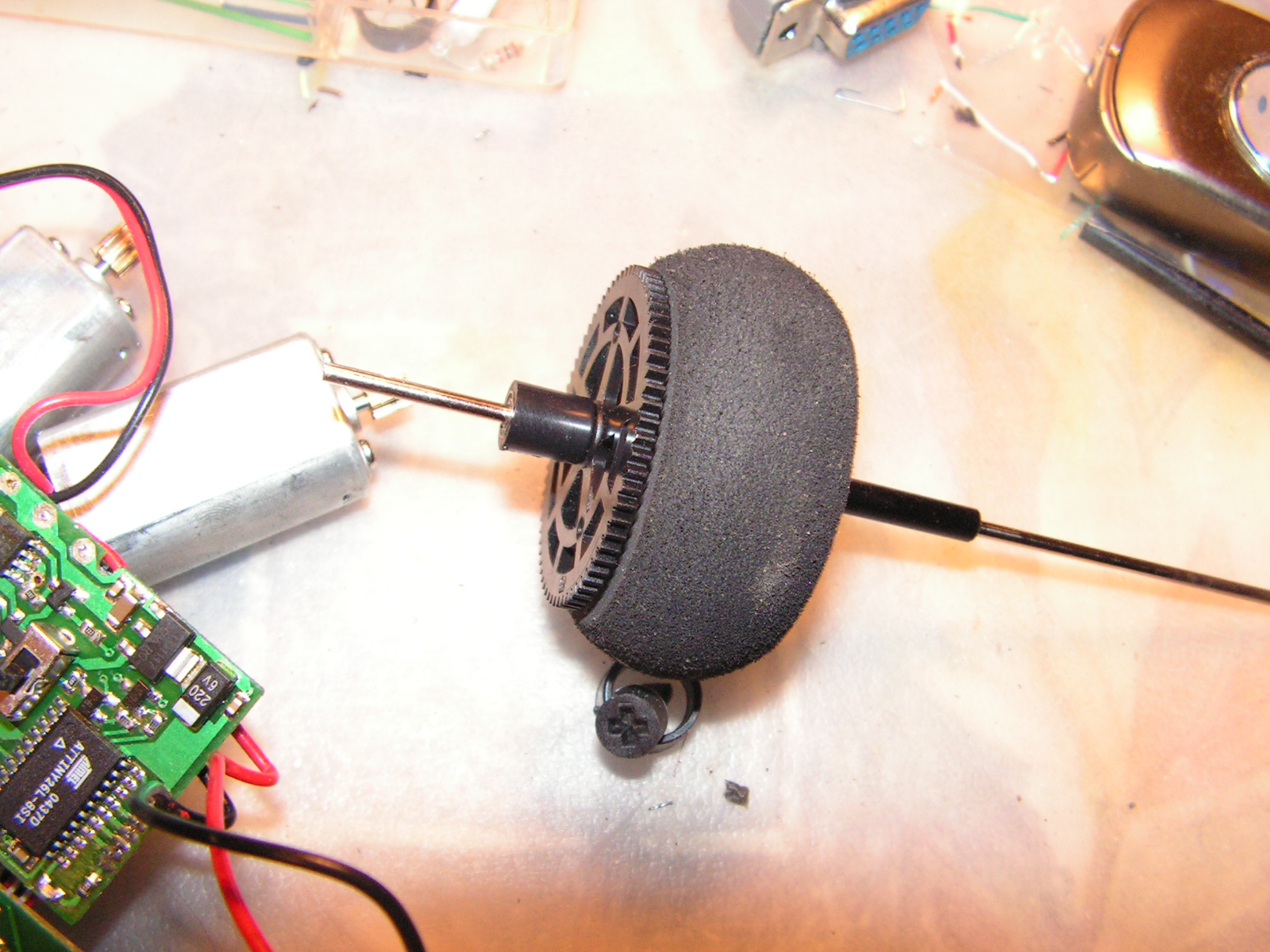 колесо одел на на внешнюю ось (на ней и шестерня была) ось - карбоновая трубка 4мм внешний диаметр, 1мм - толщина стенок
