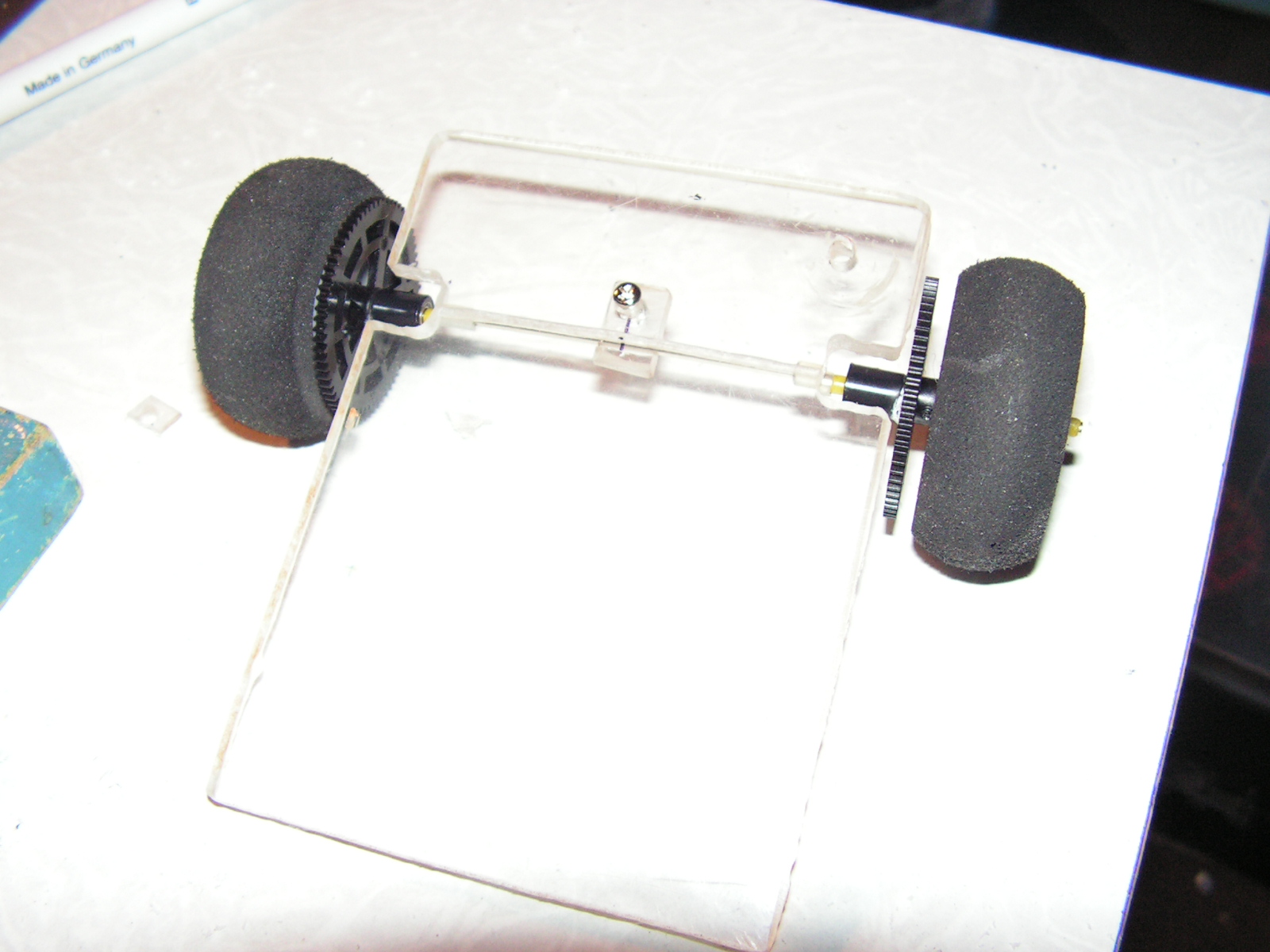 колеса тоже модельные, пришлось рассверлить ось до 4мм и с одной стороны 6мм под подшипник (к сожалению 5x2 подшипников небыло, они лучше подошли бы)