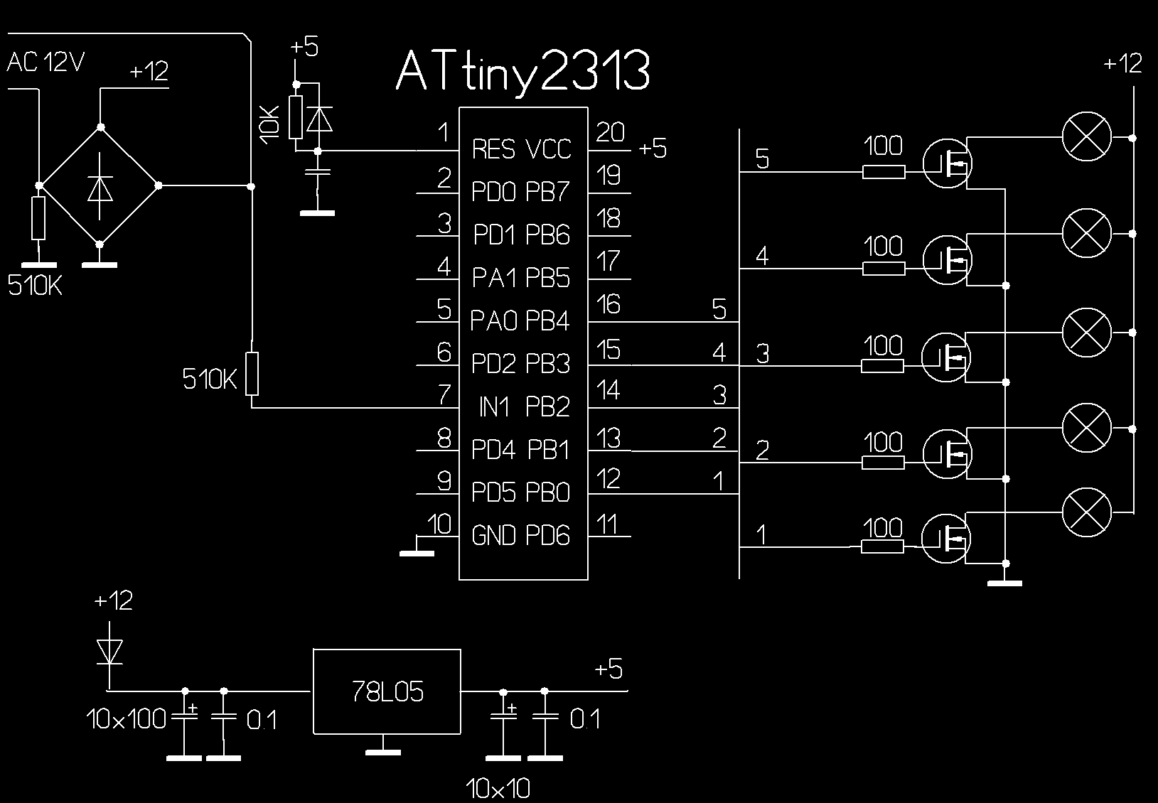 Есть идея сделать звездное небо, чтоб плавно зажигались звезды(лампы) и тухли через некоторое время. В туалете на потолке 5 лампочек таких горят в холостую, хочу оживить. К примеру зажигаем 5 сек, горим 3 сек, тухнем 5 сек, не горим 10 сек, каждой лампочке свой мигальный план.