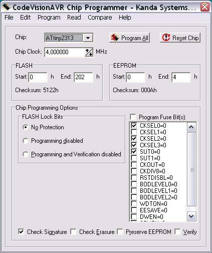 частота 4 Мгц от внутреннего генератора. фьюзы: