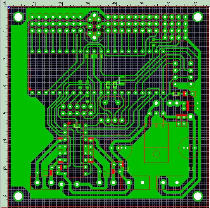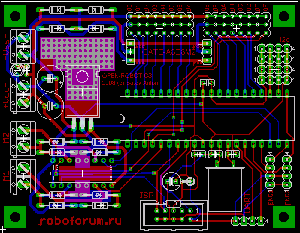 Duhas писал(а):до меня дошло )) вопщем пока без подписи... если интересует могу подписать.. соответствие не полное ... добавлен 1 кондер на питании на ножках мк.. питание в некоторых слуаях идет через перемыки смд, это даже плюс.. будут служить дросселями.. существует 3 проводных перемычки: 1 - земля под драйвером движков.. 2 и 3 - питание к перемычкам для верхних групп разъемов.. разъемы оставлены в тех группах что и раньше ... такчто с ними все должно быть ясно и без подписи.. размер 74х74.. в архивах бмп и лэй файлы... ибо жпг уж очень ужасный...