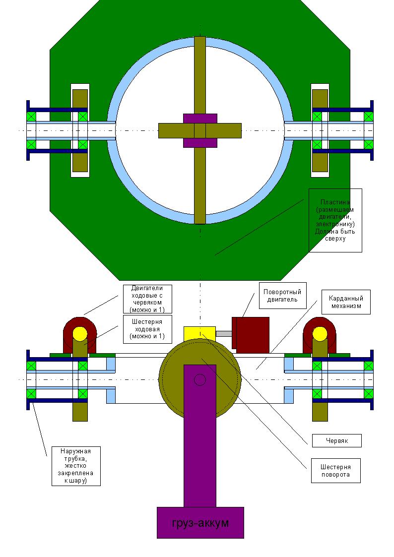 Внутри шара механизм, смещающий груз (аккумуляторы) отностительно оси шара вперед (для движения вперед), назад и вправо-влево для поворотов.