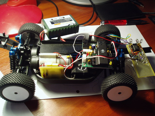 Обратную связь от двух фото-транзисторов заводим на + и - операционника, а его втыкаем в TL494. Получается что если у нас робот съехал в одну сторону - 494 снижает скважность ШИМа и серва крутит в одну сторону. Если наоборот - то в другую! Ну, там коэф. усиления подстроить чтоб не олтало его сильно и все дела! А главное питание там от 5 до 15 спокойно, никакого программирования и все просто как топор!