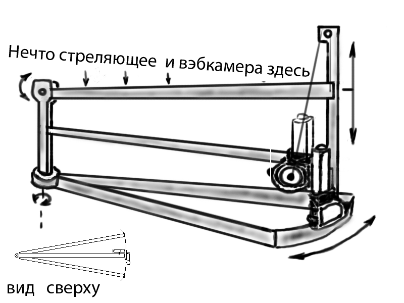 Представляется такое поворотное устройство: Станина: Два уголка 50см и сектор длиной 35см (радиус сектора 50см) скрепляются межсобой образуя треугольник, в вершину устанавливаем подвижную ось 20см Средняя часть: Т образная часть длина50см ширина 30см, неподвижно крепится с одной стороны к оси треугольника на высоту 10см с другой стороны крепим 2 моторчика от стеклоподъемников, таким образом, чтобы один из них, своим валом ездил бы по ребру сектора треугольника, обеспечивая повороты по горизонтали, а другой перпендикулярно к нему. Верхняя часть: Несущяя на себе нечто стреляющее и вэбкамеру 50см, с одной стороны крепится к верхушке оси треугольника, подвижно по вертикали, с другой стороны за нить, пропущенную через колесико в верхней точке Т-образной средней части и закрепленную на валу второго стеклоподъемника, обеспечивая повороты по вертикали.
