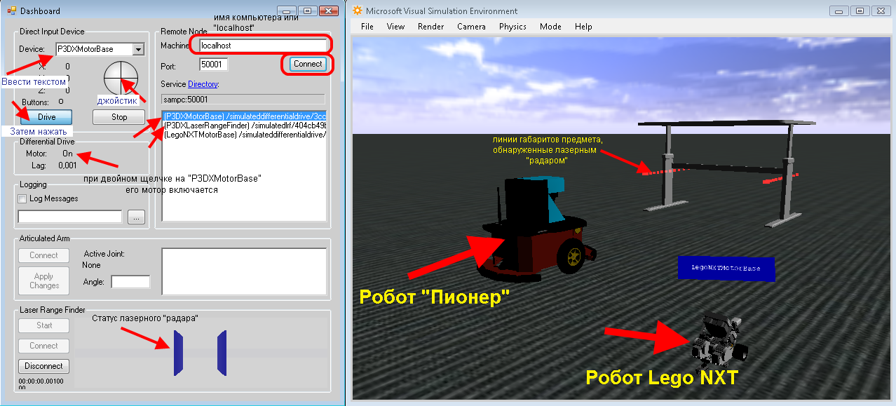 чтобы посмотреть работу симулятора, можно загрузить в VisualStudio солюшн из папки "C:\<userFolder>\Microsoft Robotics Dev Studio 2008\samples\SimulationTutorials\Tutorial2\SimulationTutorial2.sln" запустить на выполнение - появится консольное окно запускаемых сервисов, затем форма управления роботами "SimpleDashboard" и окно эмулятора, в котором на поверхности будут выстоены стол и два робота "Пионер" и "Лего" нужно приконнектиться к ним, введя в поле MAchine "localhost", и не указывая порт (установится автоматически), остальное можно увидеть на картинке и видео