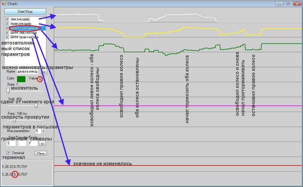 Данные получаются через UART в посылках формата S;1;2;3;4;5;F или другого: старт, разделитель, финиш - настраиваются, межде ними - данные (количество варьируется). Динамически строятся графики состояния, возможно смещать нулевые оси сигналов и масштабировать их. При старте список полученных параметров автозаполняется в лист. Параметры можно затем именовать. Цвета присваиваются автоматически. Возможно изменение скорости прокрутки от 50 мс до 1 сек. (хотя 1 сек это условное ограничение).