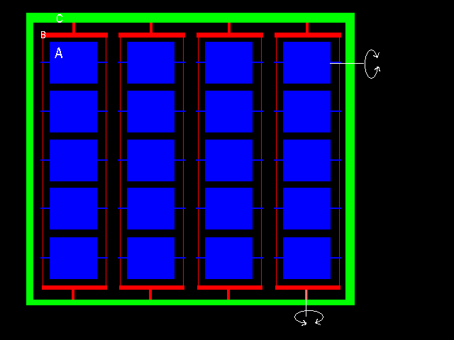 А сами вертикальные рамки (каждая тоже имеет изначальный угол поворота, отличающийся от соседней) соединены между собой с помощью рычагов, по типу вертикальных жалюзи. Таким образом, если общая рама "С", наклонена на угол соответствующий движению солнца, то возможно управляя (например сервомотором) положением вертикальных рамок "В" (синхронно всеми)... направлять солнечный свет на жёстко закреплённый приёмник, который может быть как водяным или воздушным, так и фотоэлектрическим преобразователем...таким образом многократно повышая кпд последнего.