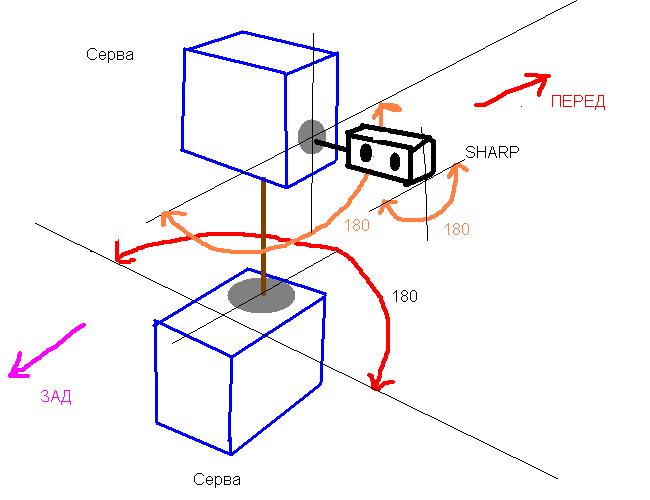2. 3 сервопривода - 2 на радиокамеру, по оси Х -360 град. желательно, по y - 180... Вообзе думаю, мощные сервы не нужны же? т.к. камеры и шшарп только крутить....
