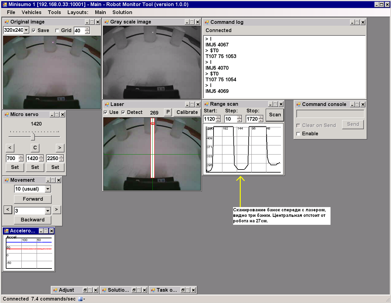 Я делаю так: a) пишу сначала весь алгоритм на ПК, камера просто дает мне изображение б) отлаженный алгоритм кодирую шаг за шагом в прошивку на С и отлаживаю на роботе. Покажу другого робота, модель 33, он немножко продвинутый по сравнению с моделю 37, которая в заедах участвовала (добавлена микросерво для поворота и лазерный модуль), а весит 490гр при габаритах 10x10 см.