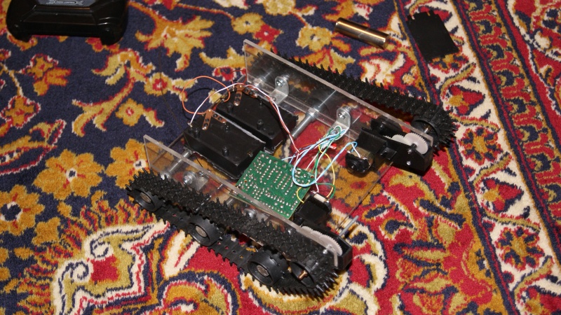Расположить аккумуляторы R20 D можно лежа и желательно по центру. Кстати чентр тяжести такого робота будет очень низким, что для танка очень благоприятно - перевернуть его будет очень тяжело. Так как вес танка не маленький, а в процессе модернизации будет расти, то, если есть возможность, советую применить подшипники качения направляющих и ведущих колес.