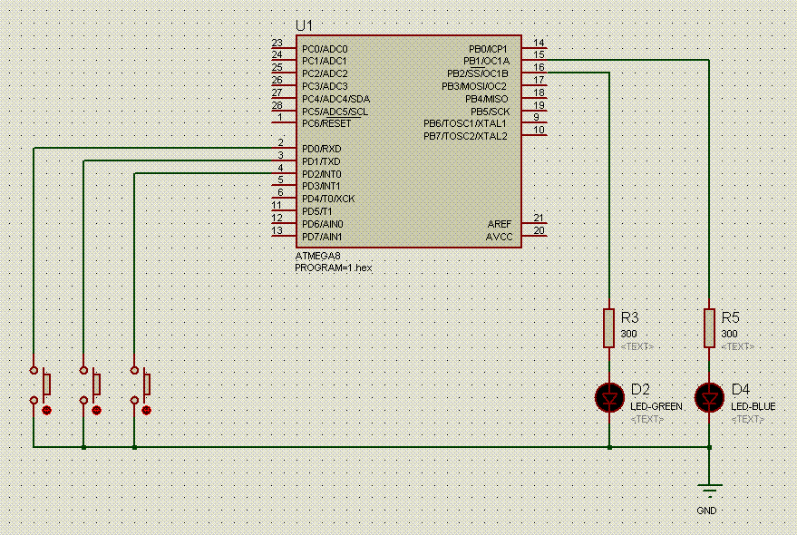 )- Если ножка PD0 соединена с землёй, и если ни одна из ножек PD1 и PD2 не соединены с землёй, то подать напряжение на ножку PB0.