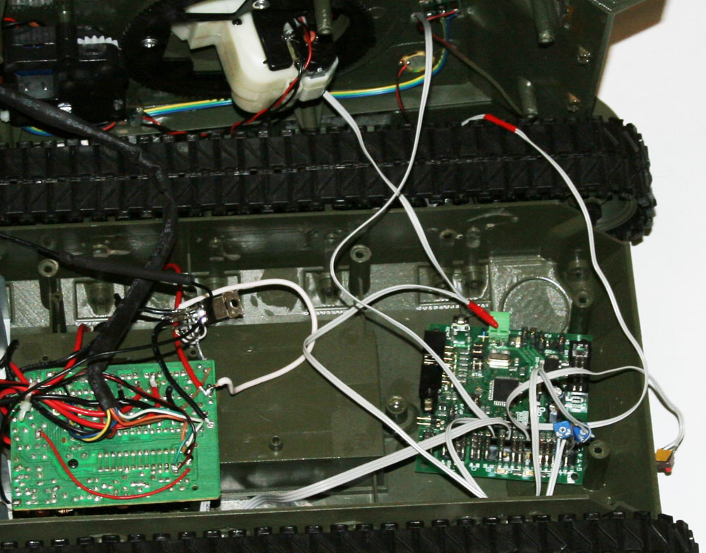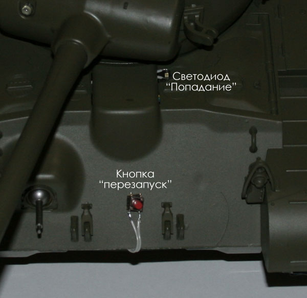 правда пока без звука и с фиксированным количеством попаданий до поражения - 3шт. После каждого попадания танк отрубается на 1сек. После 3-го попадания отрубается до нажатия вынесенной кнопки "перезапуск".