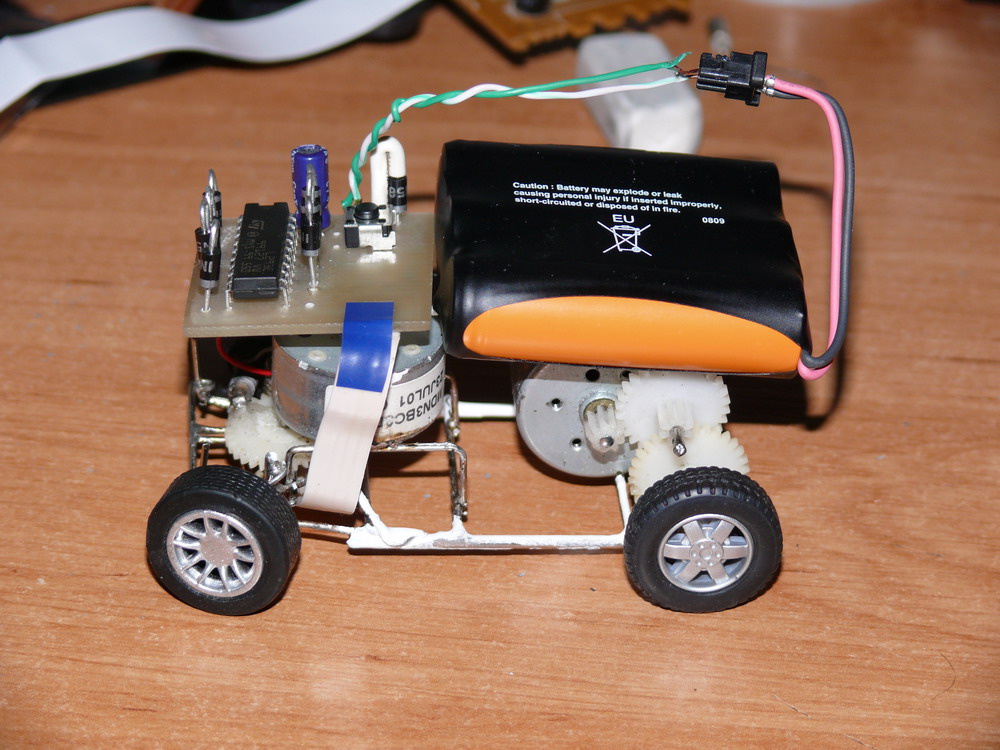 маханький автомобильчик.Напаял к нему схемку Мега8 + Л293Е ,а Тсопы, радио управление братан приделает