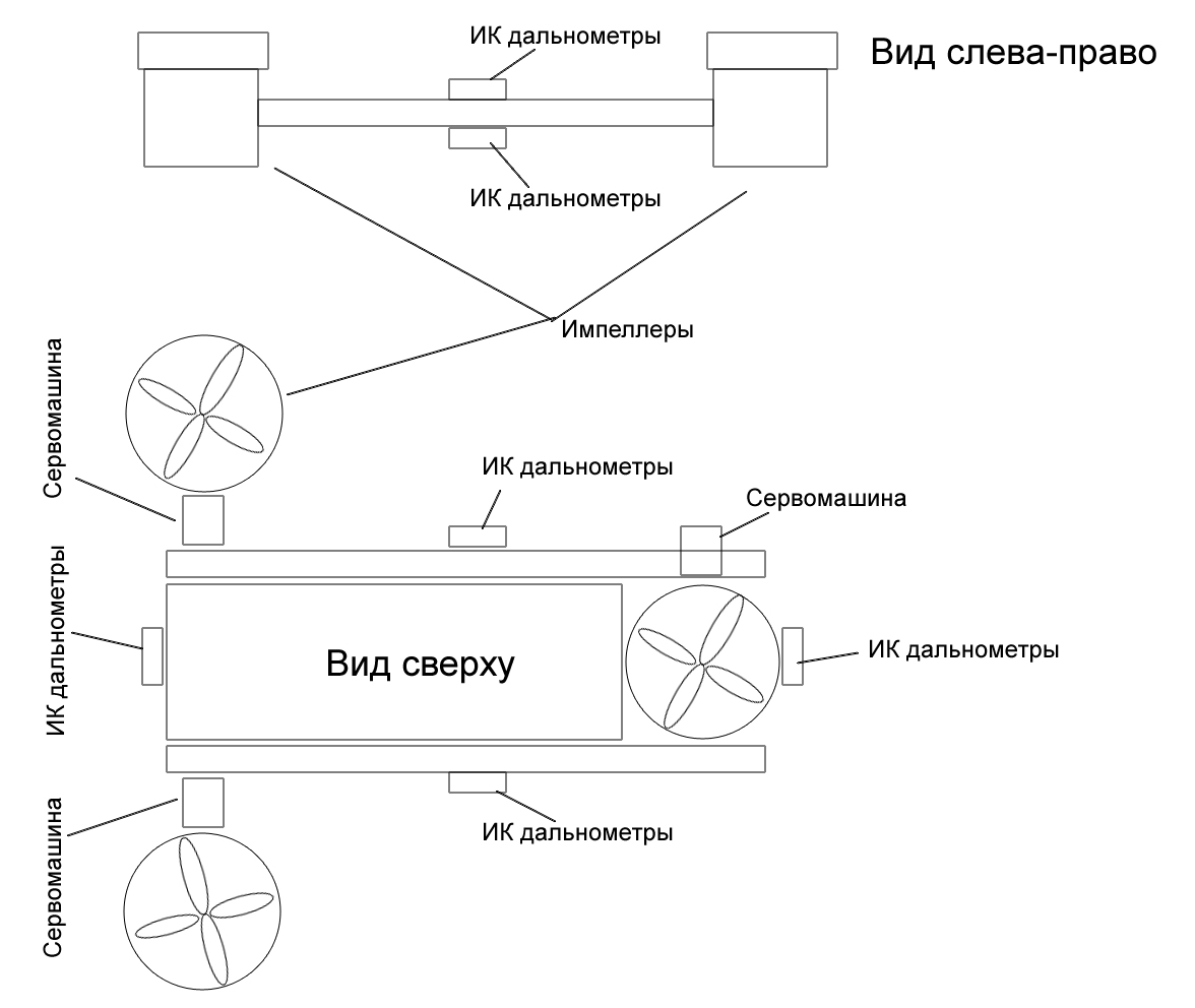 Сервомашины будут поворачивать импеллеры на 15гр. по и против часовой стрелки (больше 15 гр.не желательно, может быть дисбаланс- проверено!)