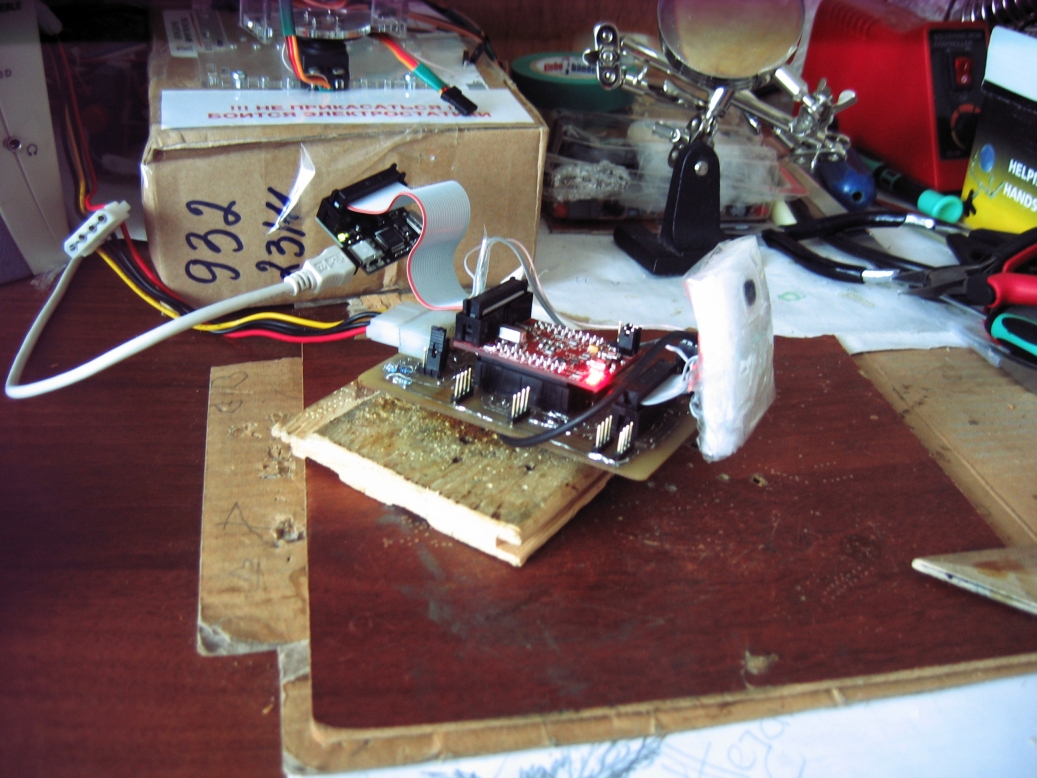 Сверху подключен JTAG-адаптер Signalyzer DT-USB-SLITE, с помощью которого я прошиваю МК и провожу отладку в чипе