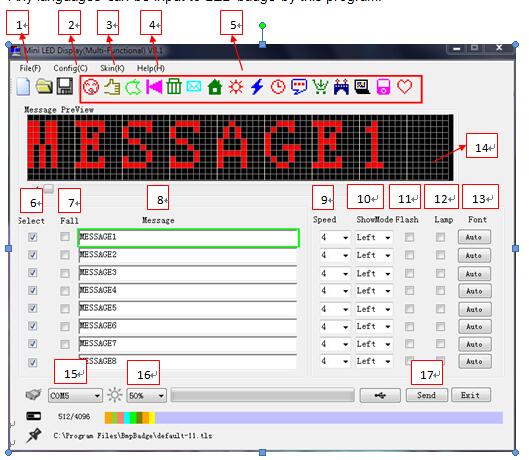 5. Далее идут 8 слов по 4 байта, определяющих разбивку памяти на 8 сообщений. Первое целое число (2 байта) должно содержать общее количество предыдущих символов в предыдущих сообщениях+ 0х0800 (для первого сообщения всегда =0х0800 т.к. предыдущих символов нет), второе целое число – это количество символов в этом сообщении. Ограничений на количество символов в одном сообщении вроде нет, но редактор прилагаемой программки ограничивает ввод 315 символами.
