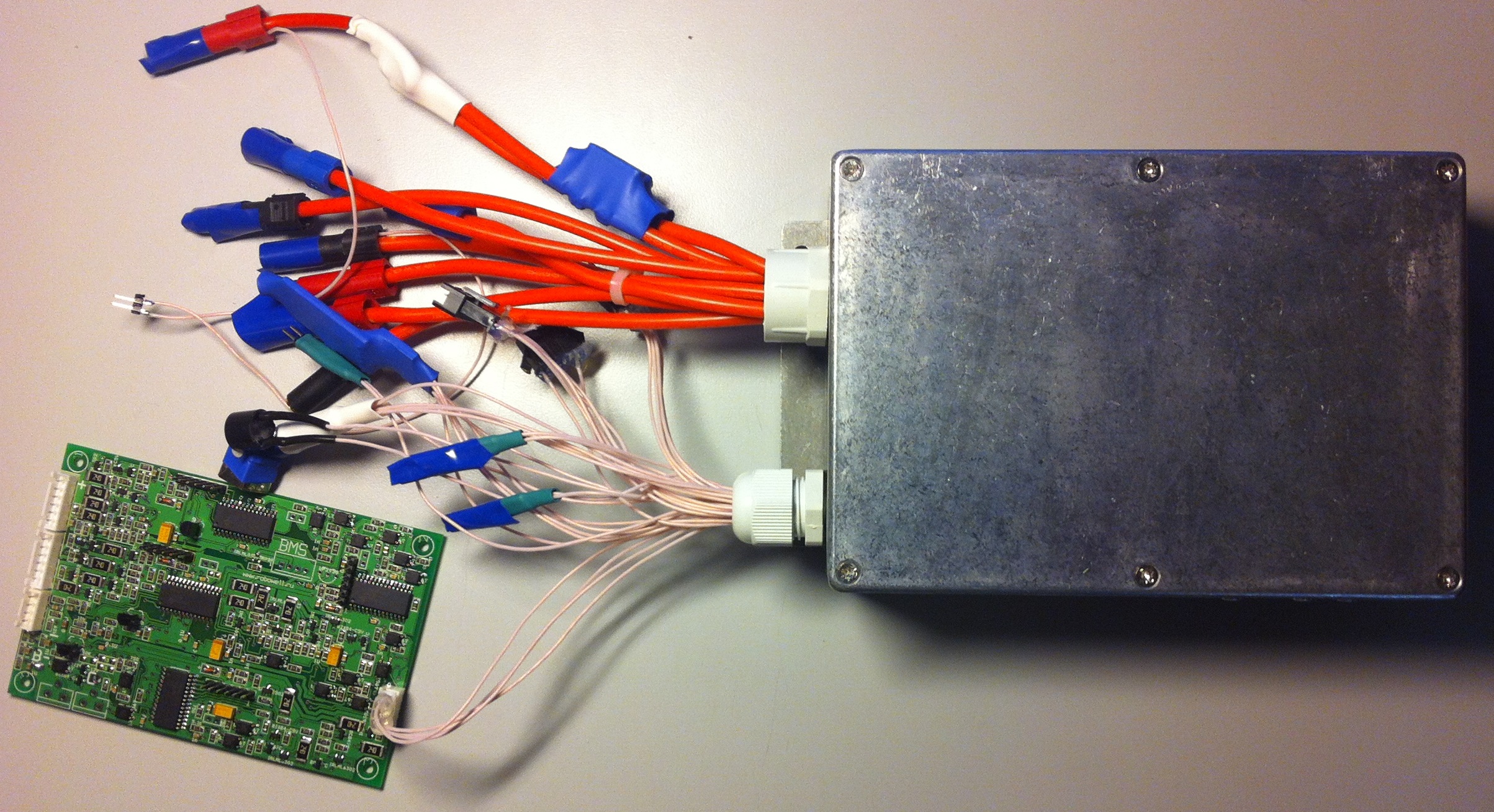 Практически все подключения делаются через разъемы, установленные на плате. Исключение - два силовых провода: + питания каждого канала. Эти провода идут на 50А предохранители, держатель для которых имеет большие размеры. Поэтому его на плату не поставишь, он стоит отдельно. Также отдельно заводится провод питания сигнализации, он идет на выключатель. Еще там есть четыре провода МГТФ для подключения BMS в правом верхнем углу. Разъем поставить можно, но в моем конкретном случае он не становится по высоте. Поэтому тут провода.
