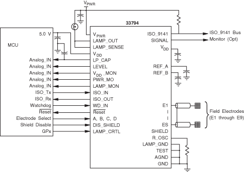 Датчик MC33794 предназначен для приложений, где требуется бесконтактное обнаружение наличия объекта и его размеров. Микросхема при помощи 9 внешних электродов создает в контролируемом пространстве слабое электрическое поле и реагирует на его изменения, создаваемые объектом.