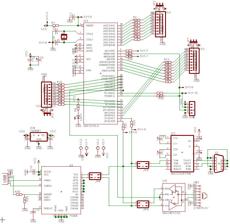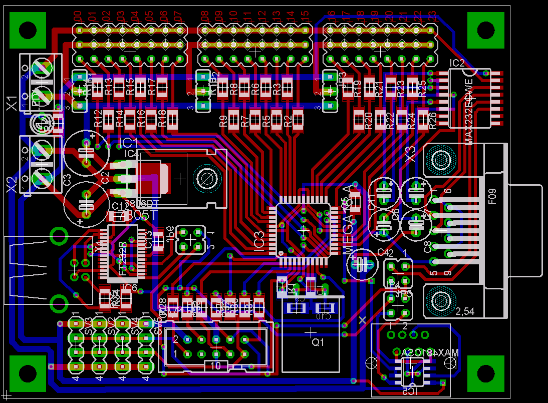 24 порта ввода-вывода, из них все могут быть дискретными входами/выходами и ШИМ-выходами на сервы, а также 8 могут быть АЦП-входами. Сгруппированные в 3 группы по 8 портов, каждой группе перемычкой можно дать стабилизированное до 5В напряжение или то, которое на входе стабилизатора (для питания серв, например, лучше напрямую их соединить с 7.2В NiCd аккумом).