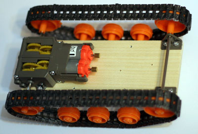 3) конструкция. в оригинале это деревянная дощечкак которой прикручена подвеска для катков, разъём для двух АА батареек с интегрированным тумблером и тамиевский редуктор, на котором висят ведущие шестерни. Редуктор позволяет при пересборке менять передаточное число (50:1 или 200:1). Сильно люфтит. Ктото говорил, что можно снизить люфт заменив шестигранные оси редуктора на нормальные, с круглым сечением. Возможно, но так же много люфта добавляют простенькие подшипники скольжения и не слишком хорошо подогнанные шестерни. Но вопщем лично меня эти люфты не слишком беспокоят. Для домашнего проэкта вполне сойдёт. Катки кстати вращаются прямо а осях, т е не закреплены на них.