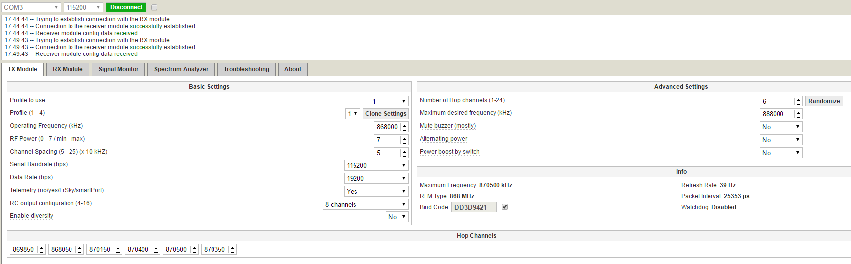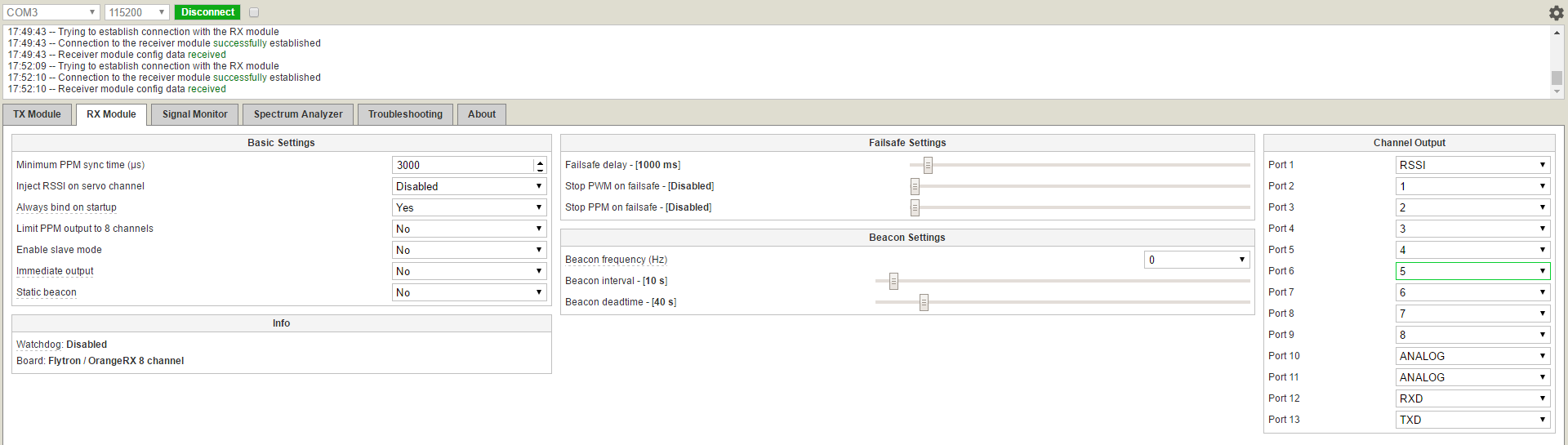 Решил обновить прошивку. Обновил. Забиндился. При включении системы всё управляется и параллельно на юарте бегает какая-то инфа(оба леда на переходнике моргают). Когда включил сериал монитор мигание прекратилось, а сериал выдал надпись, как по ссылке выше(modeOpenLRSng TX starting *версия* on HW 2)