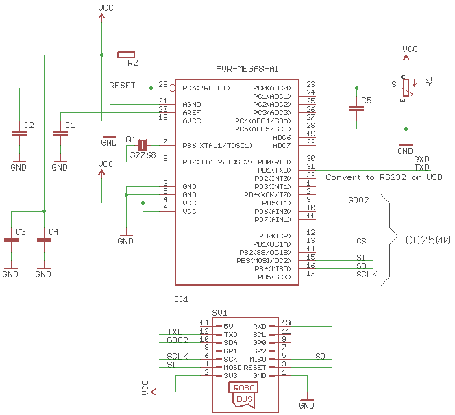 Чтобы обеспечить достаточно большой период измерения без использования прерываний (для повышения точности) использован "часовой" кварц (32768Гц). Тактирование МК осуществляется от внутреннего RC-генератора. Результат измерения выдается через UART. Так как частота RC-генератора не устанавливается точно, для подстройки скорости передачи через UART используется подстроечный резистор. Частота кварцевого резонатора подключенного к CC2500 делится на 4 и с вывода GDO2 подается на вход таймера-счетчика 1. Подключение входа таймера-счетчика 1 показано на схеме для текущей схемы "мегаплаты" EdGull'а.