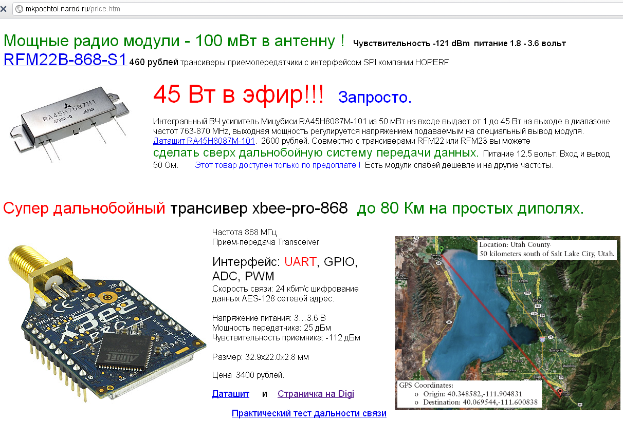 На эту частоту есть модули Digi в наличии до 80 км в прямой видимости с диполем, куча каналов, шифрование и прочая лабудень.Anubis писал(а):Для телеметрии и управления можно использовать 868 МГц, например модуль RFM12B-868. При хорошей антене и наличии антенного усилителя обещают дальность 2-3км.