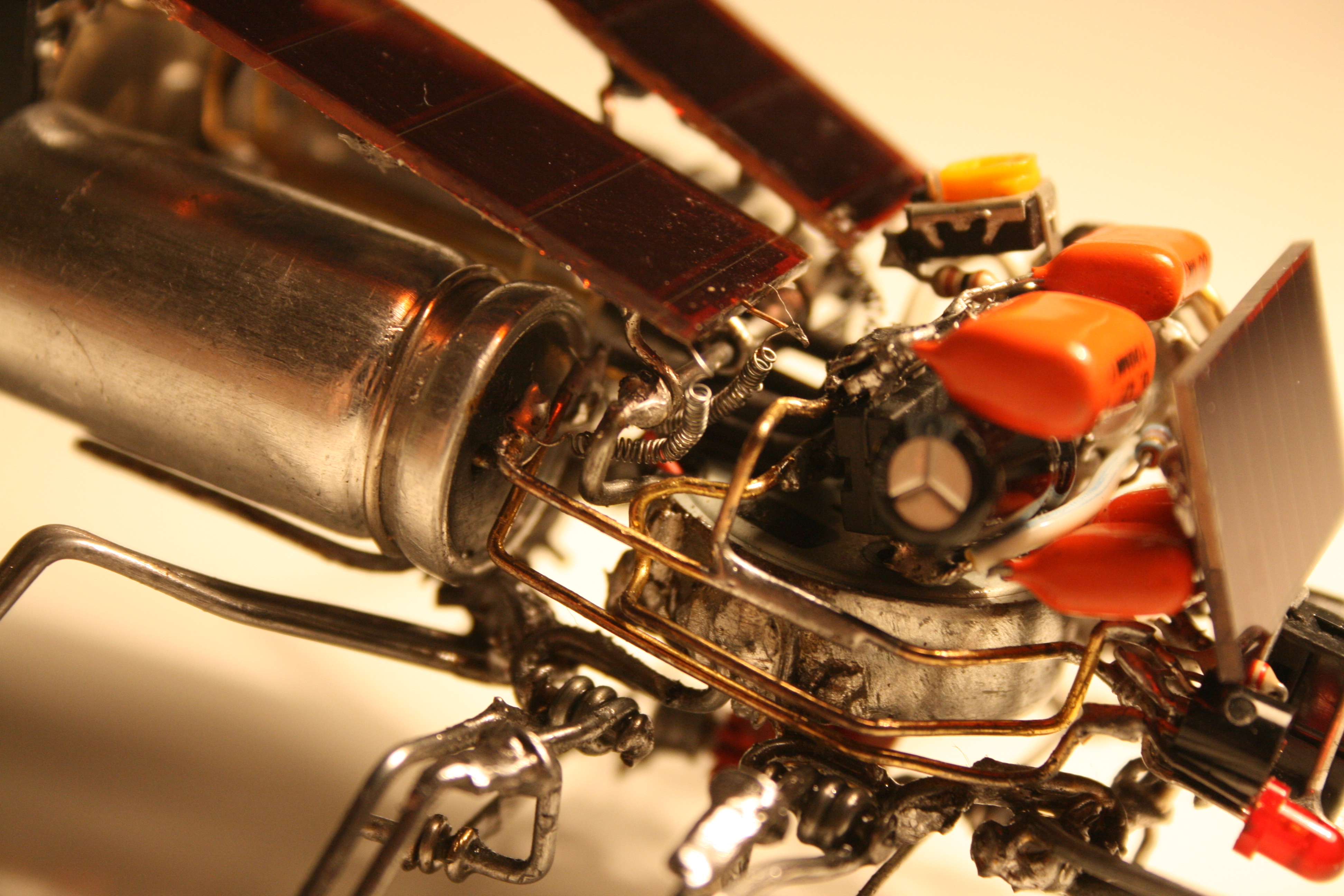 . Так же использовал пару десятков метров скрепок и пару кило припоя. Вместо проводов использовал золотистого цвета скрепки. Купить пришлось только большой емкости конденсаторы на 10 000 мкф, 3 солнечные батарейки, микрочип, пару мигающих светодиодов и транзисторы. При создании использовались всем известные электронные схемы, ну или может почти всем известные