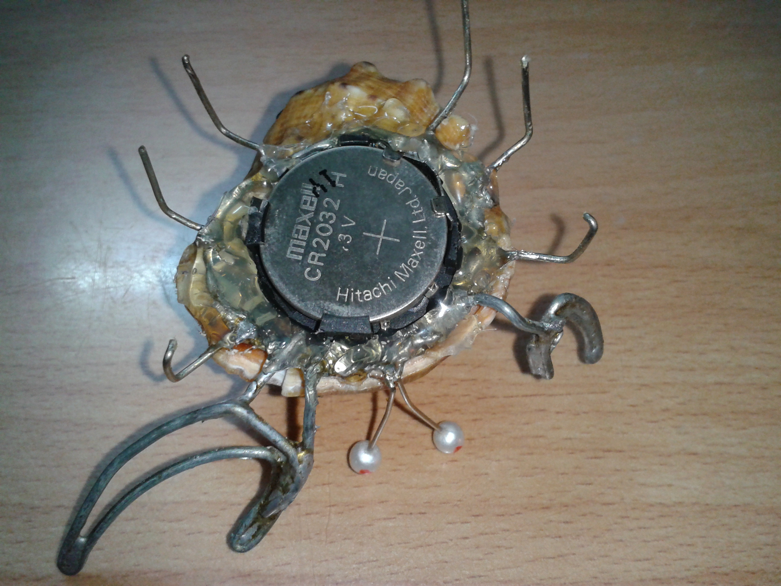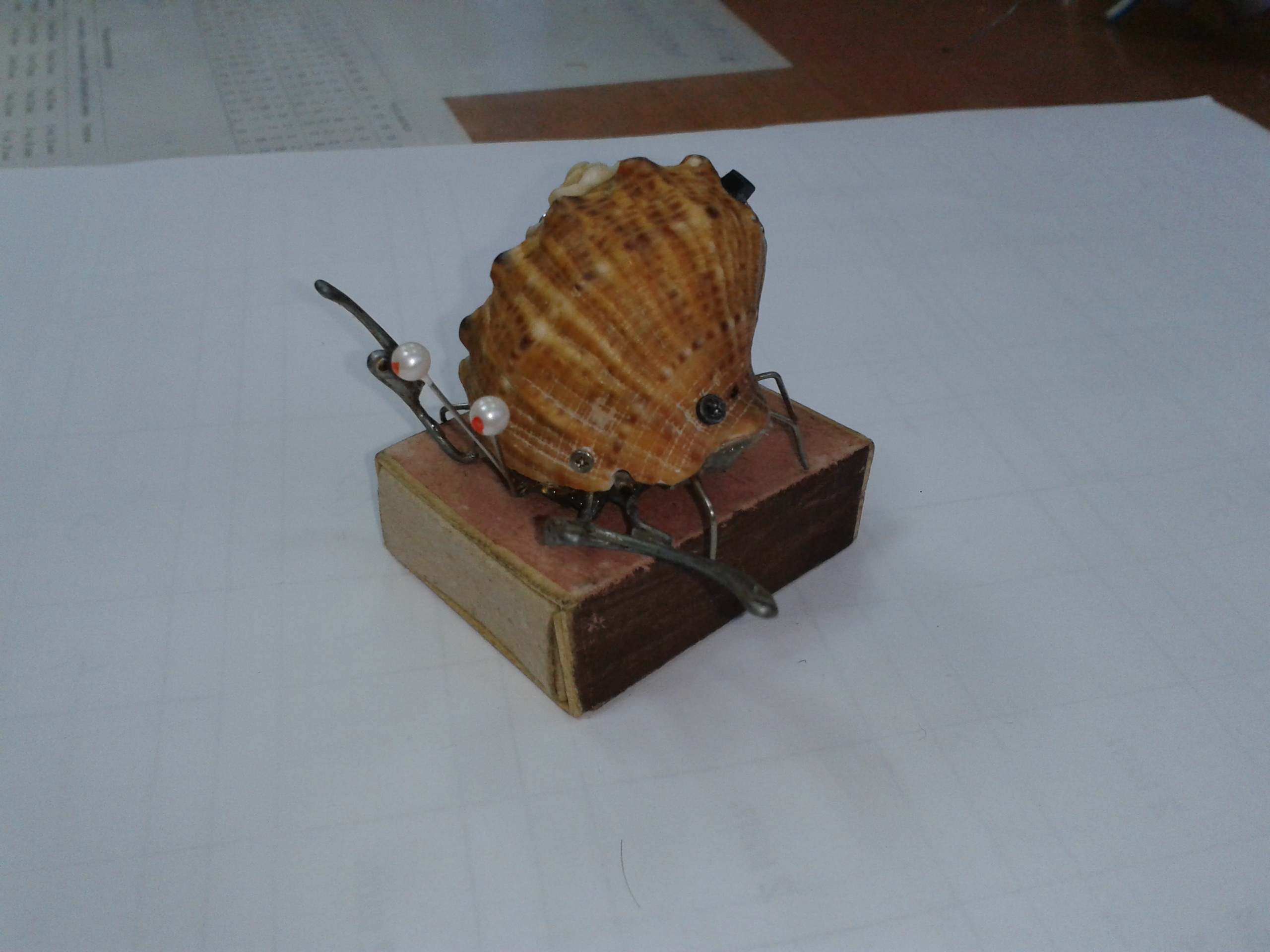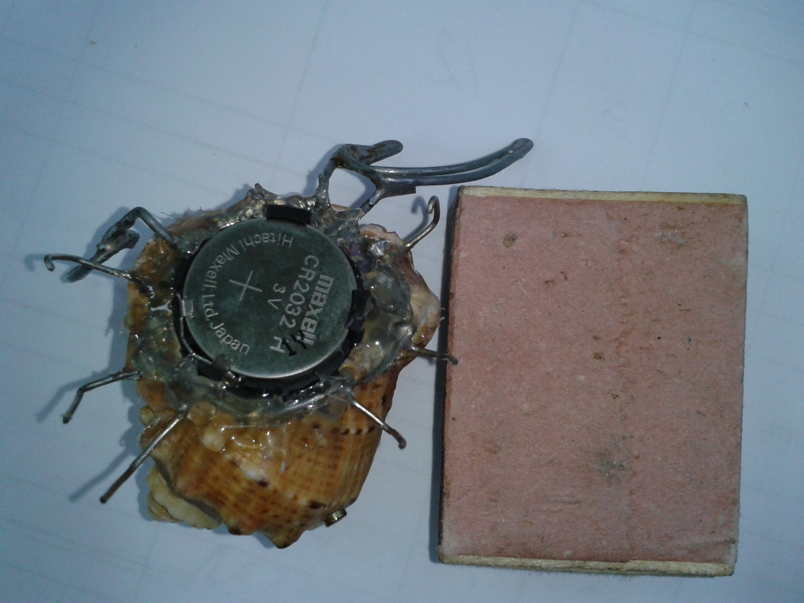 из-за того что ракушка тяжелая, я в нее два вибрика засунул, потому-что с одним вибриком еле шевелился от этой батарейки. У меня была мысль примострячить фоторезисторы, чтобы на свет ездил, но подумал, что когда будет мало света, он будет уныло работать, а фонариком в моську светить не айс