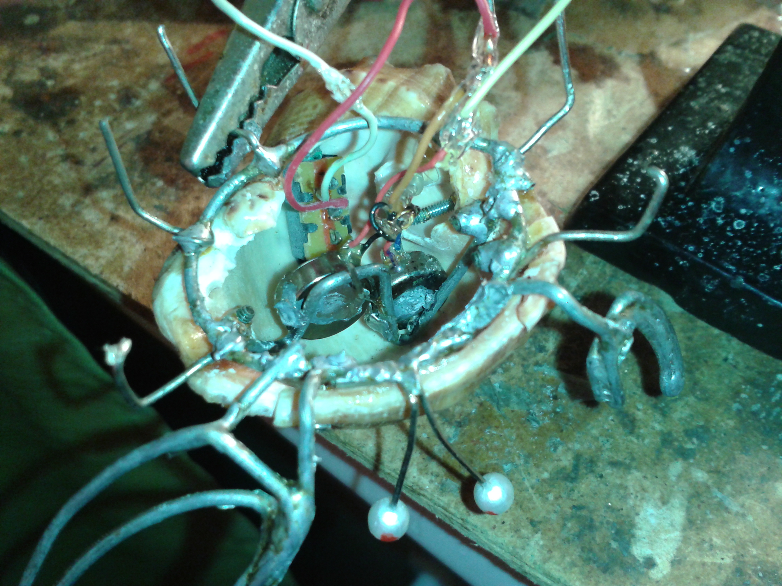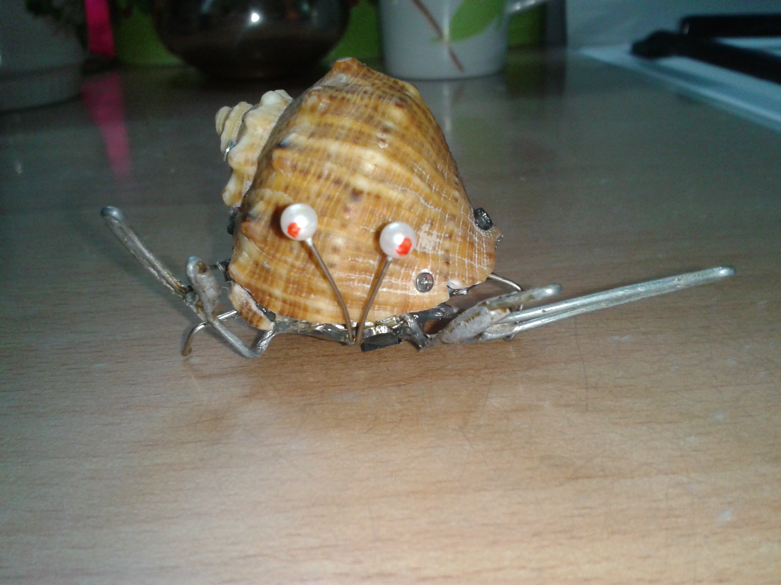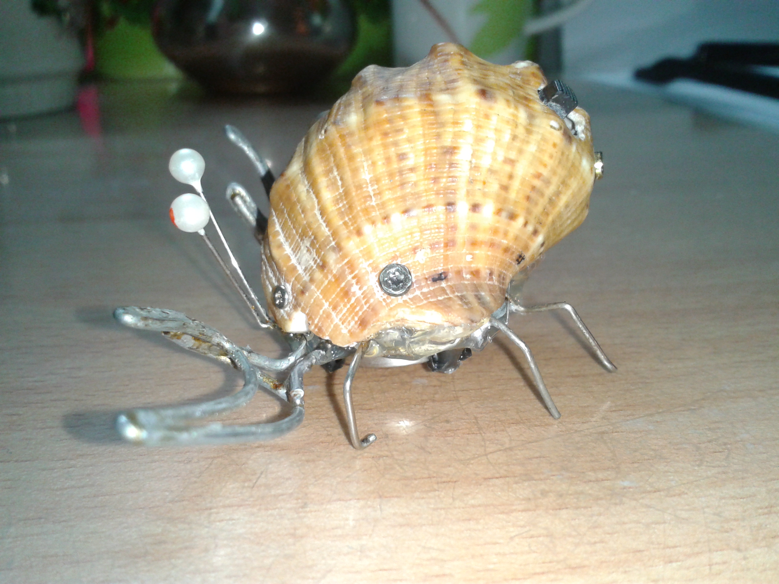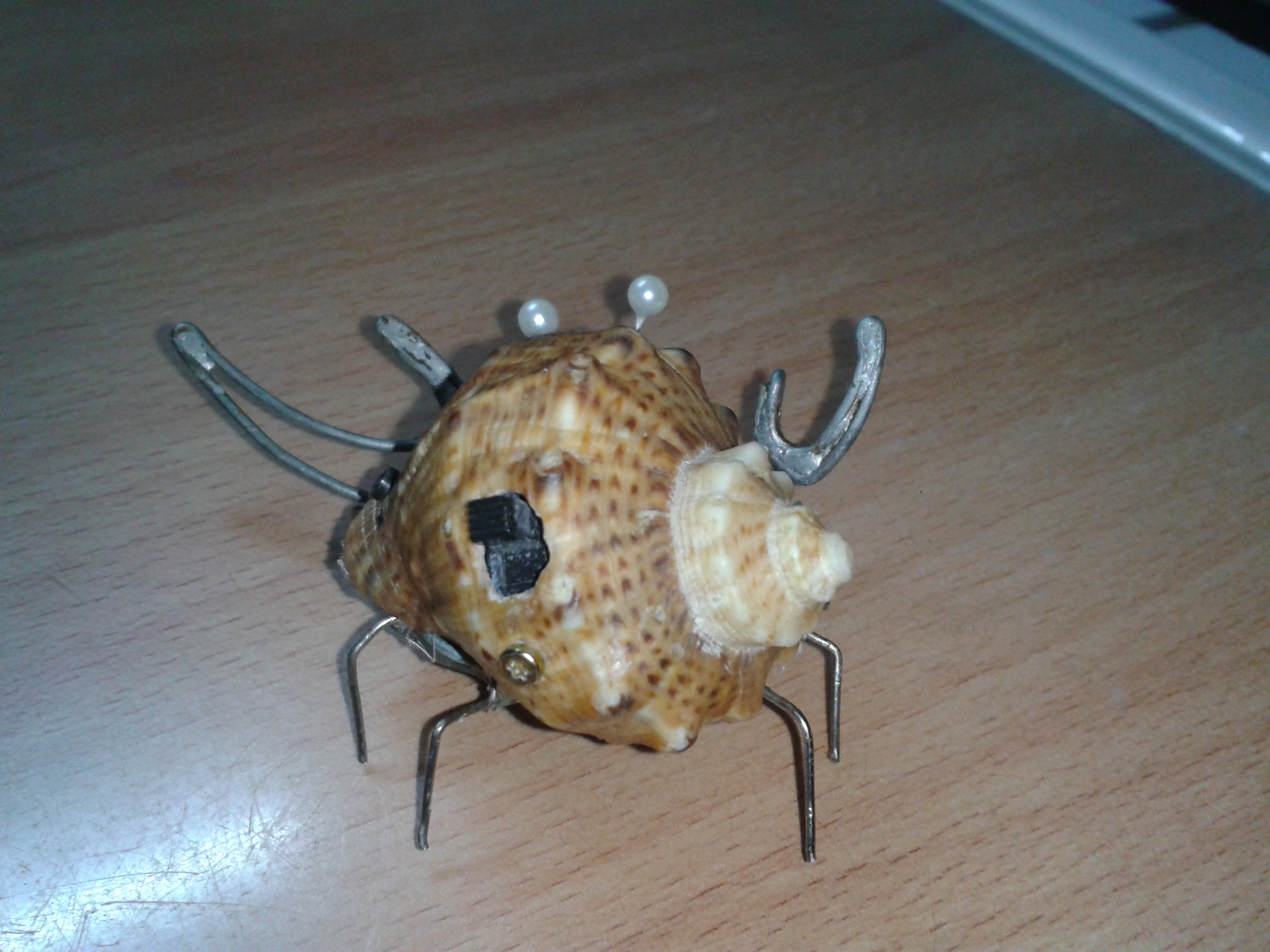из-за того что ракушка тяжелая, я в нее два вибрика засунул, потому-что с одним вибриком еле шевелился от этой батарейки. У меня была мысль примострячить фоторезисторы, чтобы на свет ездил, но подумал, что когда будет мало света, он будет уныло работать, а фонариком в моську светить не айс