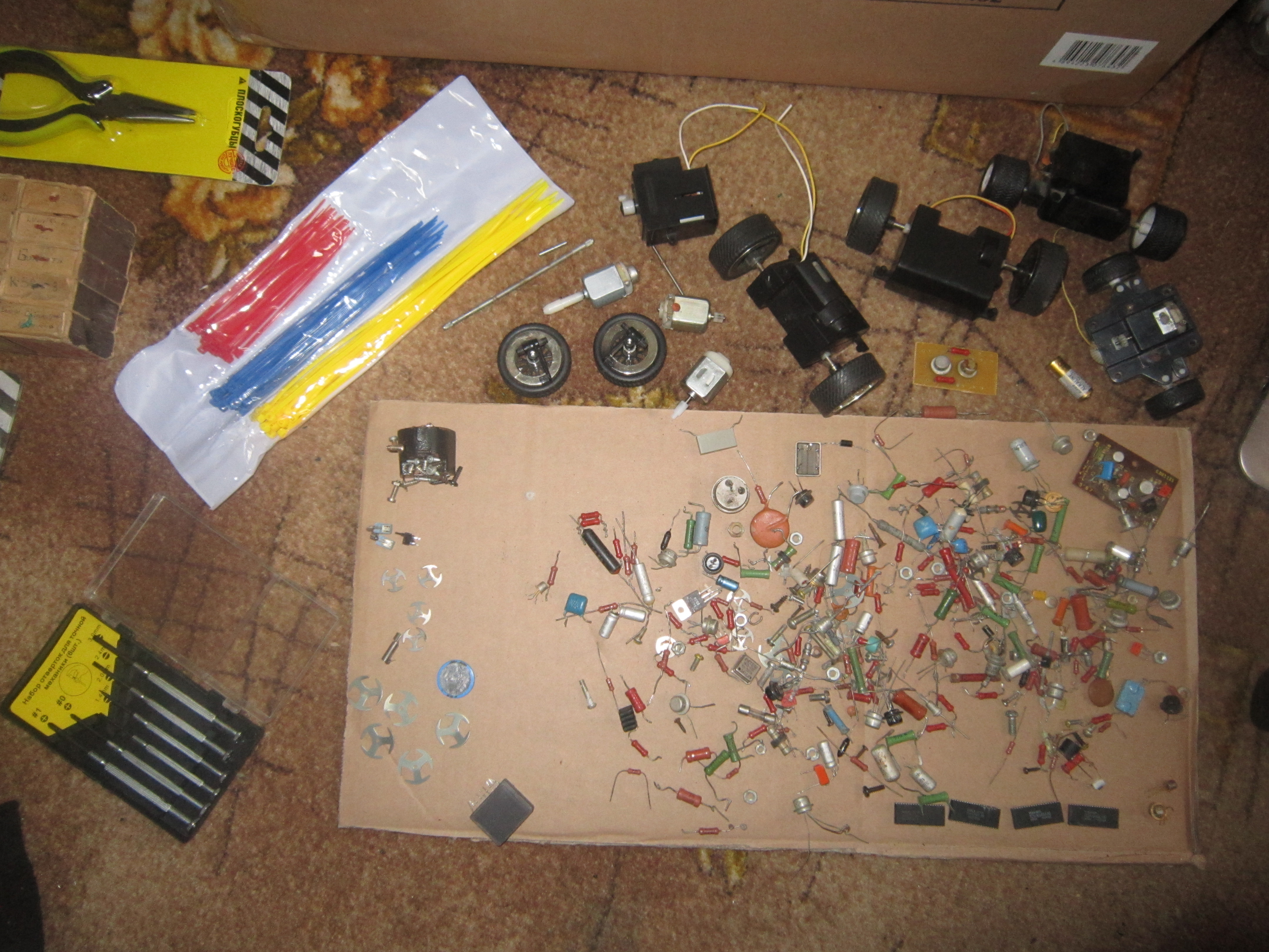 от себя все то же мнение - купить готовый набор согласно твоему уровню (или эл.лаборатория для школьников, или полусобранный кит для сборки робота из тех магазинов что перечислил). Это на первом времени съэкономит время, чтобы не искать комплектуху которую или ждать с почты или "в другом магазине" покупать.