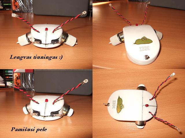 Собрал себе такого зверя. Первый блин как говорится :oops: .... Как фотодиоды тоже использую ИК светодиоды ( большие такие). Только вот такая проблема- тяго- и энерговооружонность просто ужасные - крона хавается очень быстро ( практически на испытаниях осталось 7 вольт). Моторы юзаю из чипдипа- QX-FF-130-14230 двиг.21х39мм 2-8V. Они конечно немаленького размера, и весят тоже немало, но таких проблем с ними быть по идее не должно: мышь без сенсоров едет кое-как, а с сенсорами вообще не едет практически. Мотор задерживается легко рукой , при этом при остановке одного из моторов останавливается и второй, напряжение падает на обоих. Напряжение на моторах не одинаковое если сенсоры не подключены, отличие примерно 30-35% (хотя по идее дифференциальный выход дает чистый 0, отсчитанный от половины питания). Когда подключил сенсоры, поведение сильно не изменилось- крутится вокруг оси ( вхолостую н свет реагирует очень заметно, светишь на 1 диод- 1 мотор дает газу). С сенсорами тоже каталась по кругу, как и без них ( свет вроде цепляет, но очень слабо, а как потеряет- останавливается). Мои идеи таковы ( 1 или несколько) 1) слабые диоды, слишком узкая диаграмма приема ( небольшой поворот от перпендикуляря к лучу, и напряжение падает в разы). Можно попытаться вылечить стачиваением пластика с диодов ( они как я уже наприсал большого размера) 2) неподходящие моторы ( написано 2-8 вольт. У меня получается 2-3 вольта на мотор, в сумме с батареи снимаю вхолостую около 6) 3) косой операционник . 4) а может колеса великоваты: 2 см. в диаметре.