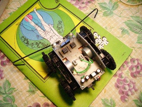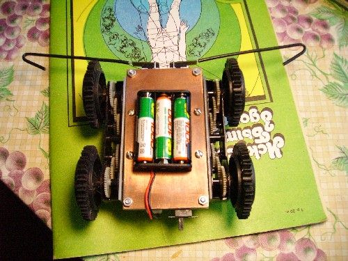 Ну вот я и сделал свою телегу из фенольных редукторов и бимовского мозга. Родные движки заменены на движки от сидиромов. Питание - 3 ААА + повышающий стабилизатор на 5 В. Мосты мосфетные (IRF7105). Мозги - два "нейрона" или два "полушария" на TINY45. Каждое полушарие подключено к своему глазу и к чужому тоже, к своему усу и к противоположному мотору. Когда чей-то ус задевает препятствие, это полушарие сообщает об этом событии другому полушарию. Поэтому сперва происходит отъезд от препятствия, потом разворот. Программа не сложная, намучился только с фотодиодами, точнее с их подстройкой. На первом видео робот едет к окну, на втором я его лампой навожу. Там в конце он остановился - это не по алгоритму - аккумуляторы сдохли . Ну и фотки смотрите, только они опять не четкие получились.
