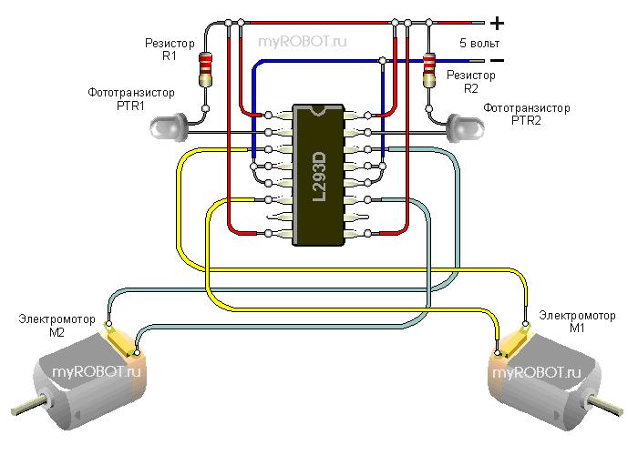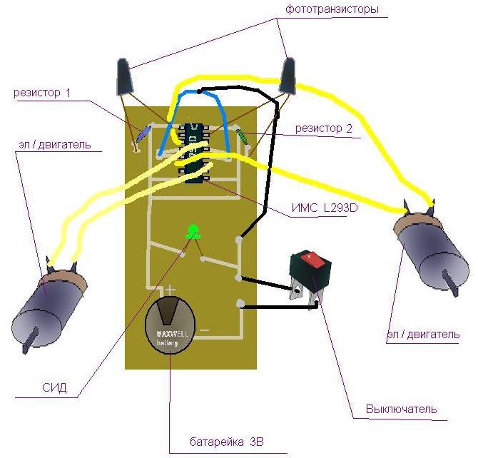 угу. короче, поотрывай от микросхемы все эти фототранзисторы-резисторы, особенно этот дурацкий контрольный светодиод - оставь только саму микросхемку, питание и моторы. Тыкай плюсом на входы, и если не заработает, микросхему пора чинить. Правильно, молотом. Заработает - с пристрастием проверяй фототранзисторы (или кто они там у тебя) - чойта кажется мне, что это инфракрасные светодиоды, которым тут не место. Третий раз не могу понять: редукторов в конструкции не предвидится? Колёса насажены на валы?