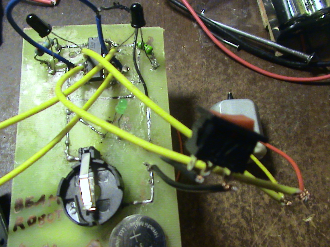 Когда концами проводков батарейного отсека трогаю ножки фототранзистора, то загорается проверочный светодиод посередине платы. Значит питание всё-таки есть. Но почему-то не идёт на моторы.